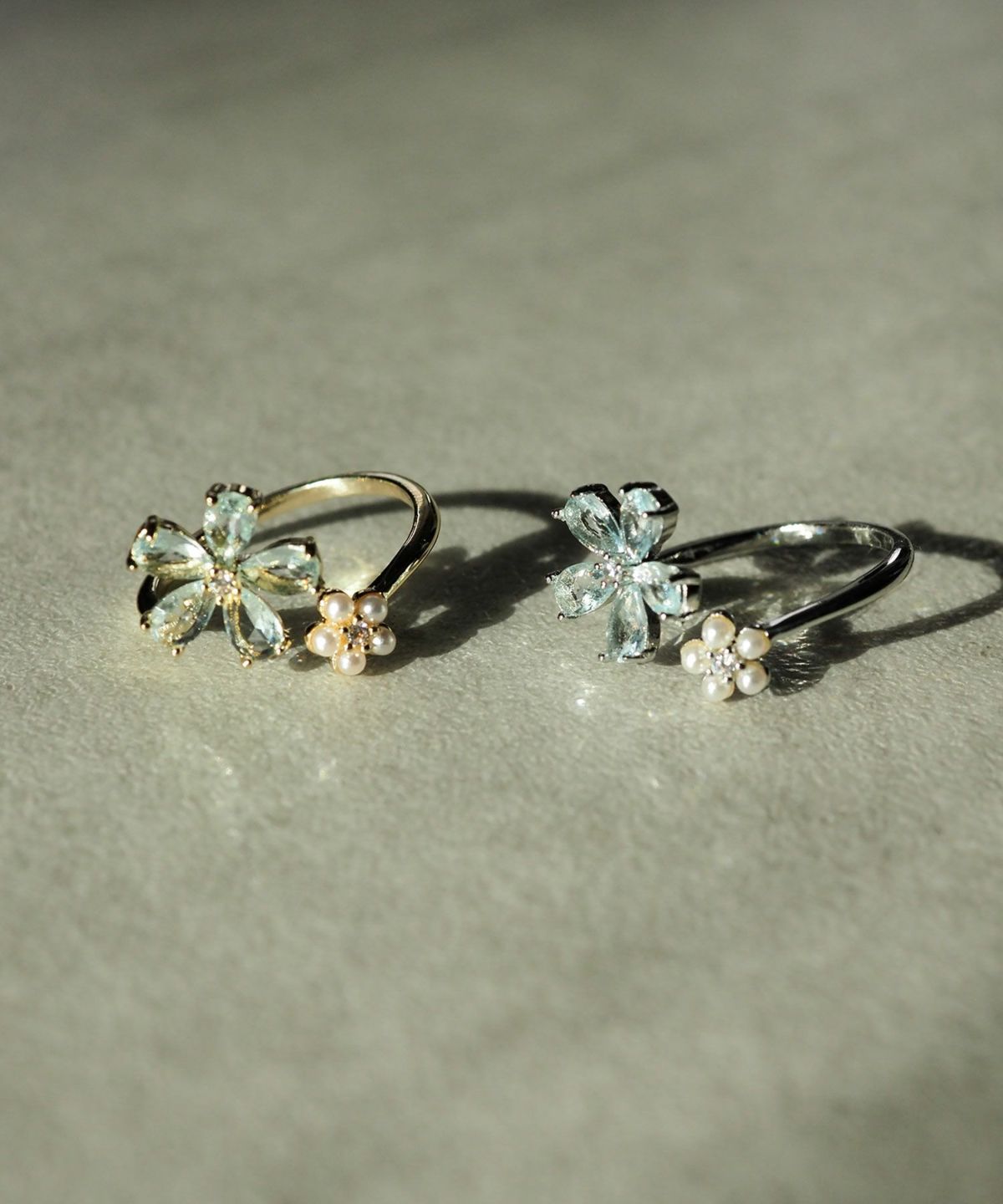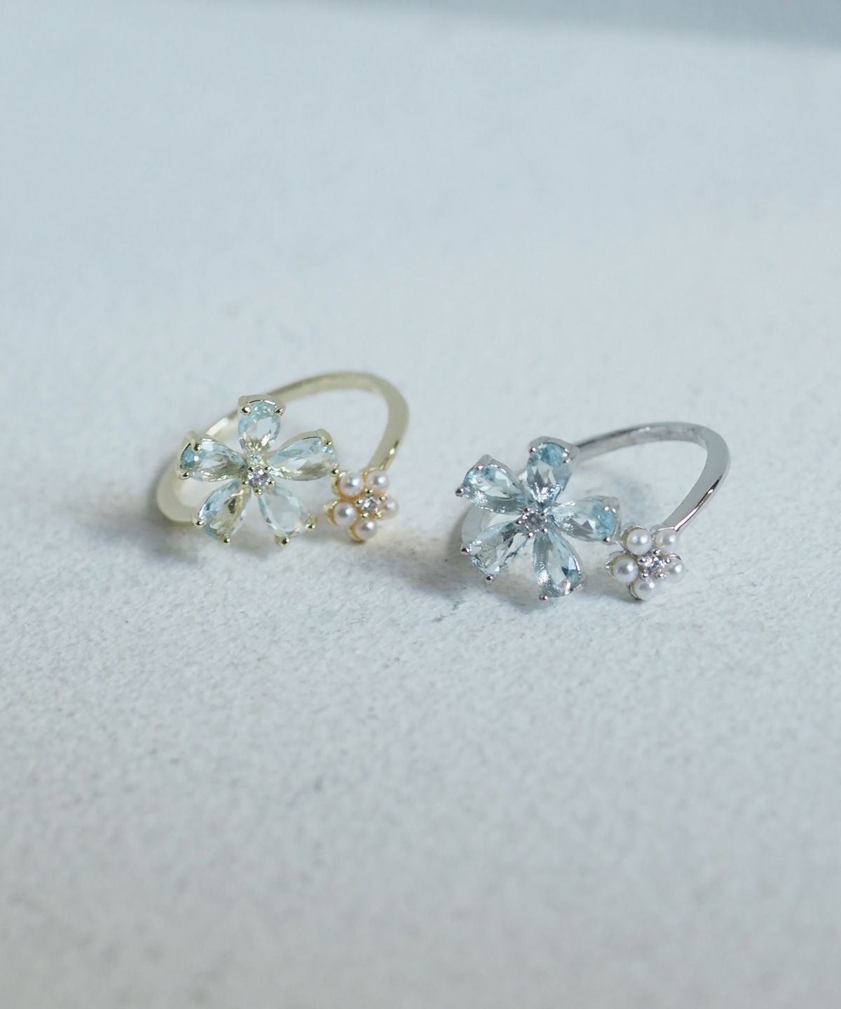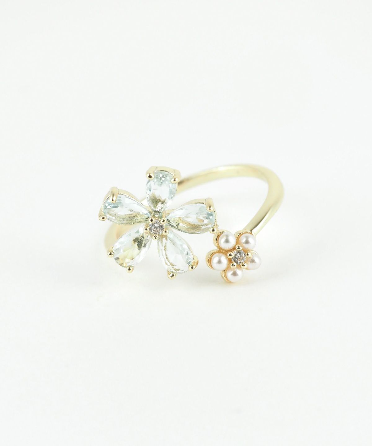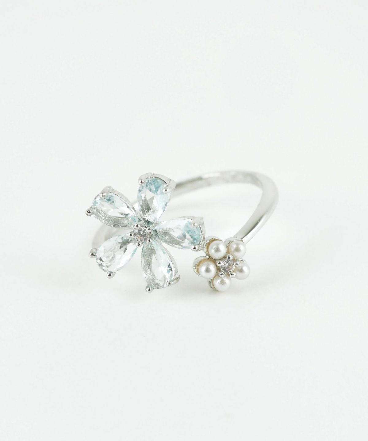 ブルーキュービックとパールの花モチーフが美しい、透明感あふれるオープンリング。 質感の異なる二つの花が、手元を優しく彩ります。程よい抜け感で、日常に爽やかな輝きを添えるアイテムです。