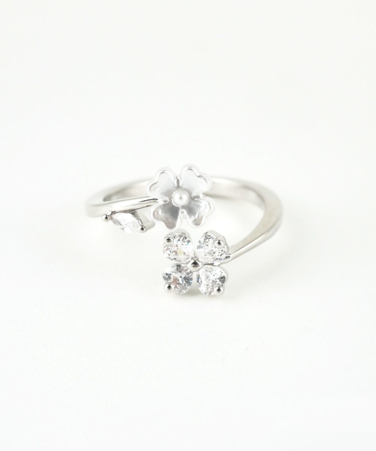 2つの異なる質感のフラワーモチーフが大人可愛いオープンリング。 アシンメトリーなデザインが、指元に抜け感と洗練された印象を与えてくれます。