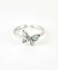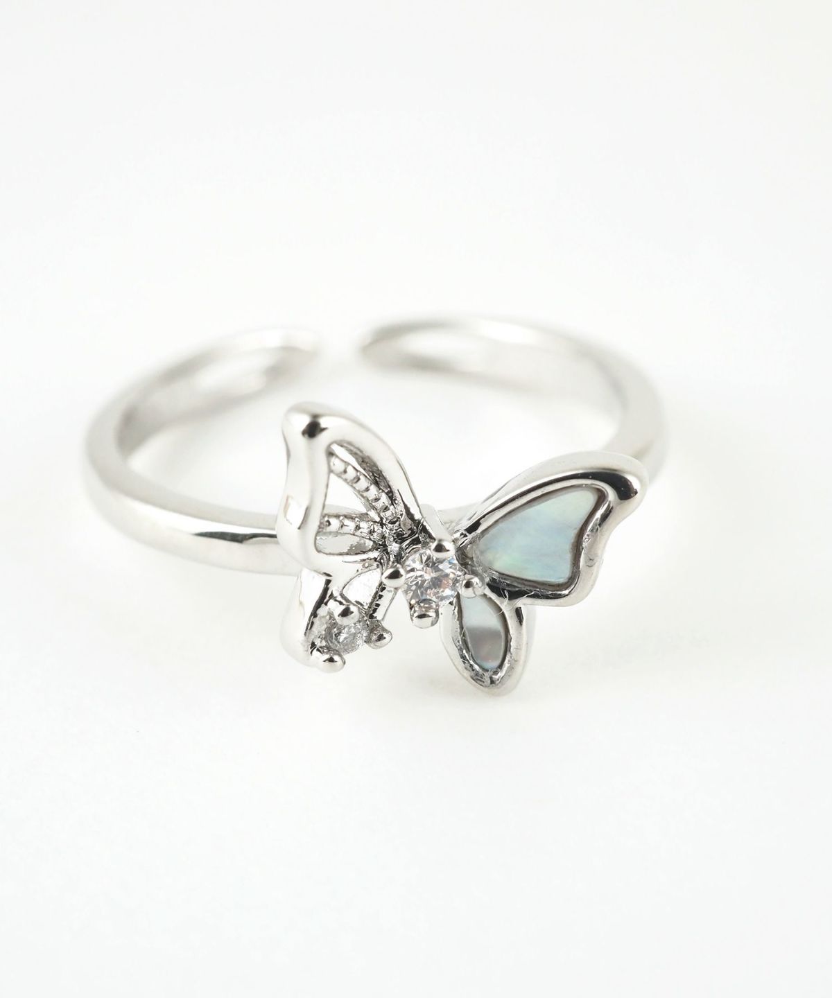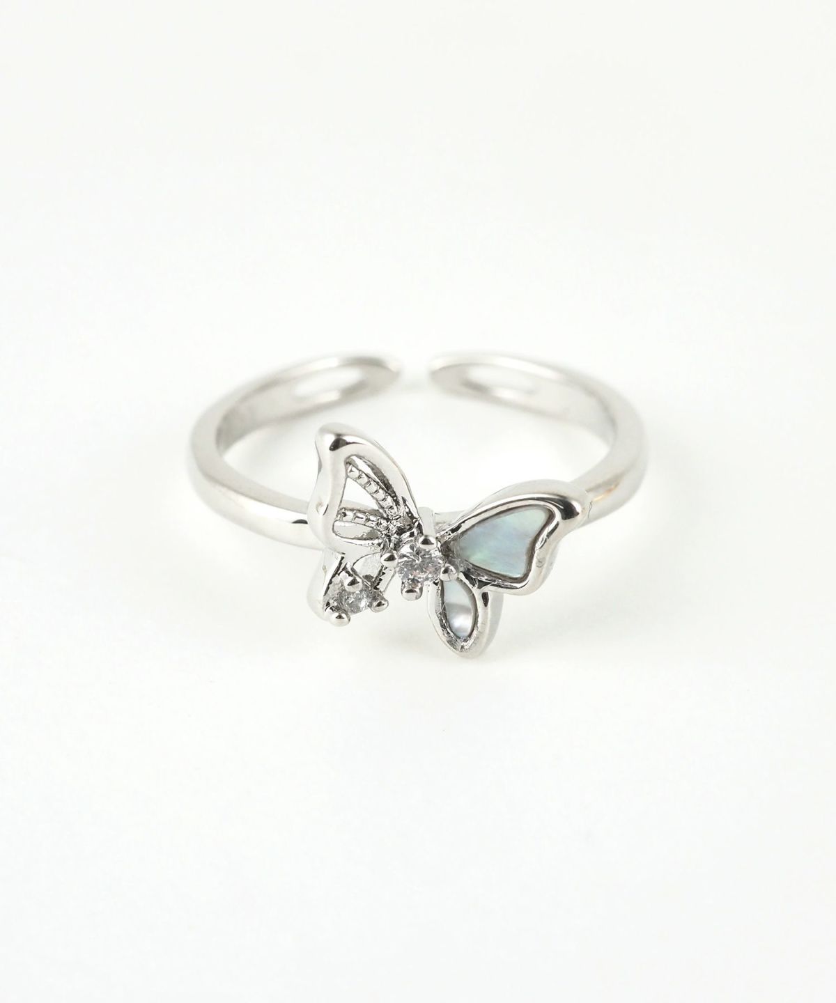 透かし模様とシェル調の輝きを纏った、大人可愛いバタフライモチーフ。サイズ調整が自由なオープンリングなので、どの指にもフィットし、贈り物としても喜ばれます。