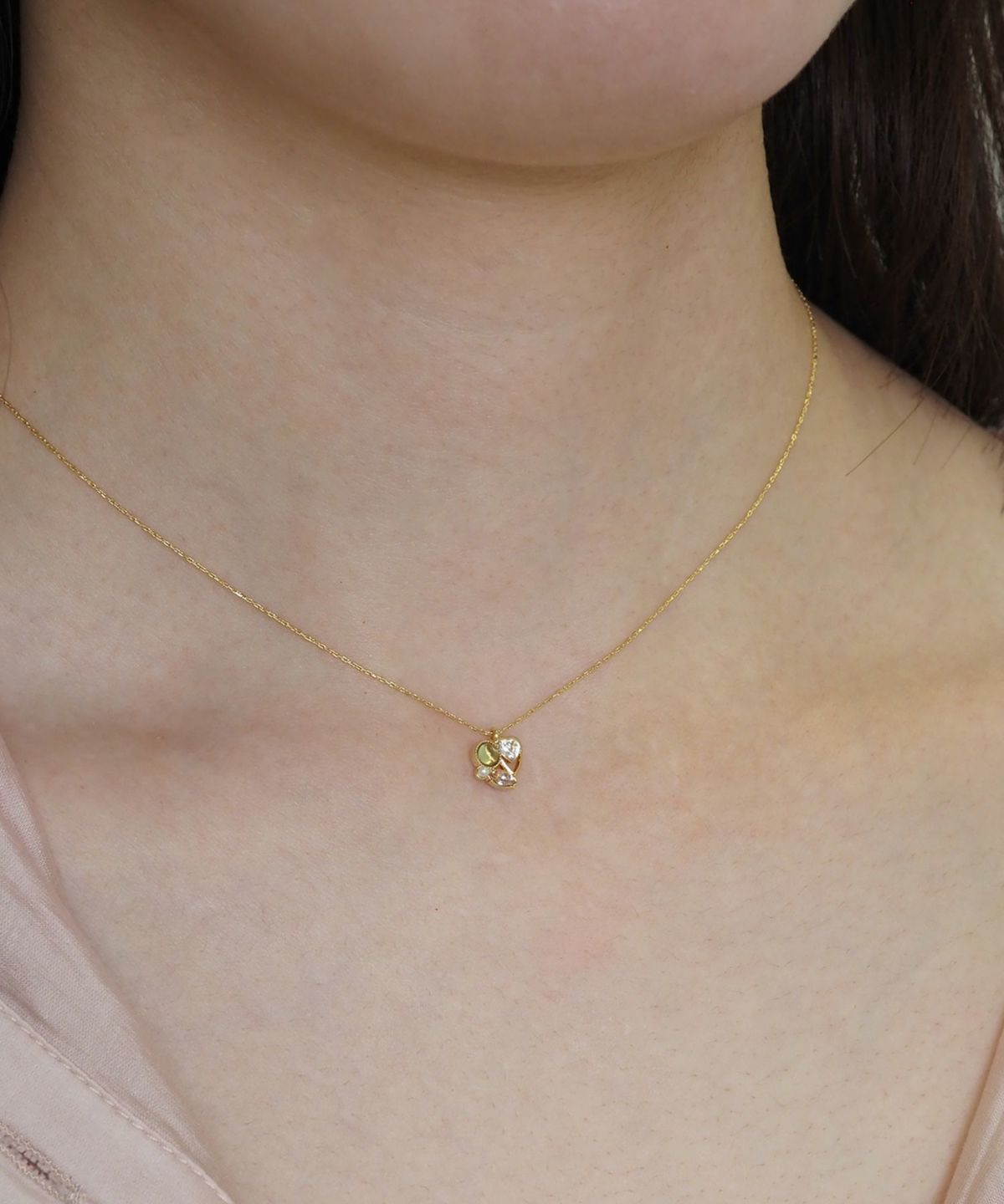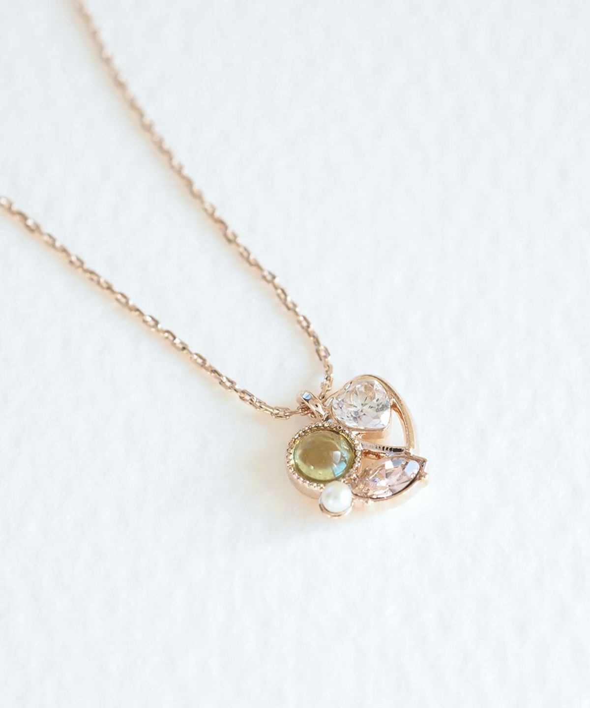 天然石の持つ運気を纏う、お守りアクセサリーシリーズ“MUK Dreamy stone”。桜の花びらが寄り添うような繊細なデザインに「太陽の石」とも呼ばれる天然石ペリドットをあしらったネックレス。ハートフレームをベースに爽やかなグリーンのペリドットやビジュー、小さなパールをバランスよく配置。春の訪れを感じさせる柔らかな配色がお顔周りを優しく明るく見せてくれます。控えめながらも華やかな存在感で、デイリーから特別な日のお出かけまでどんなシーンにも品よく馴染みます。