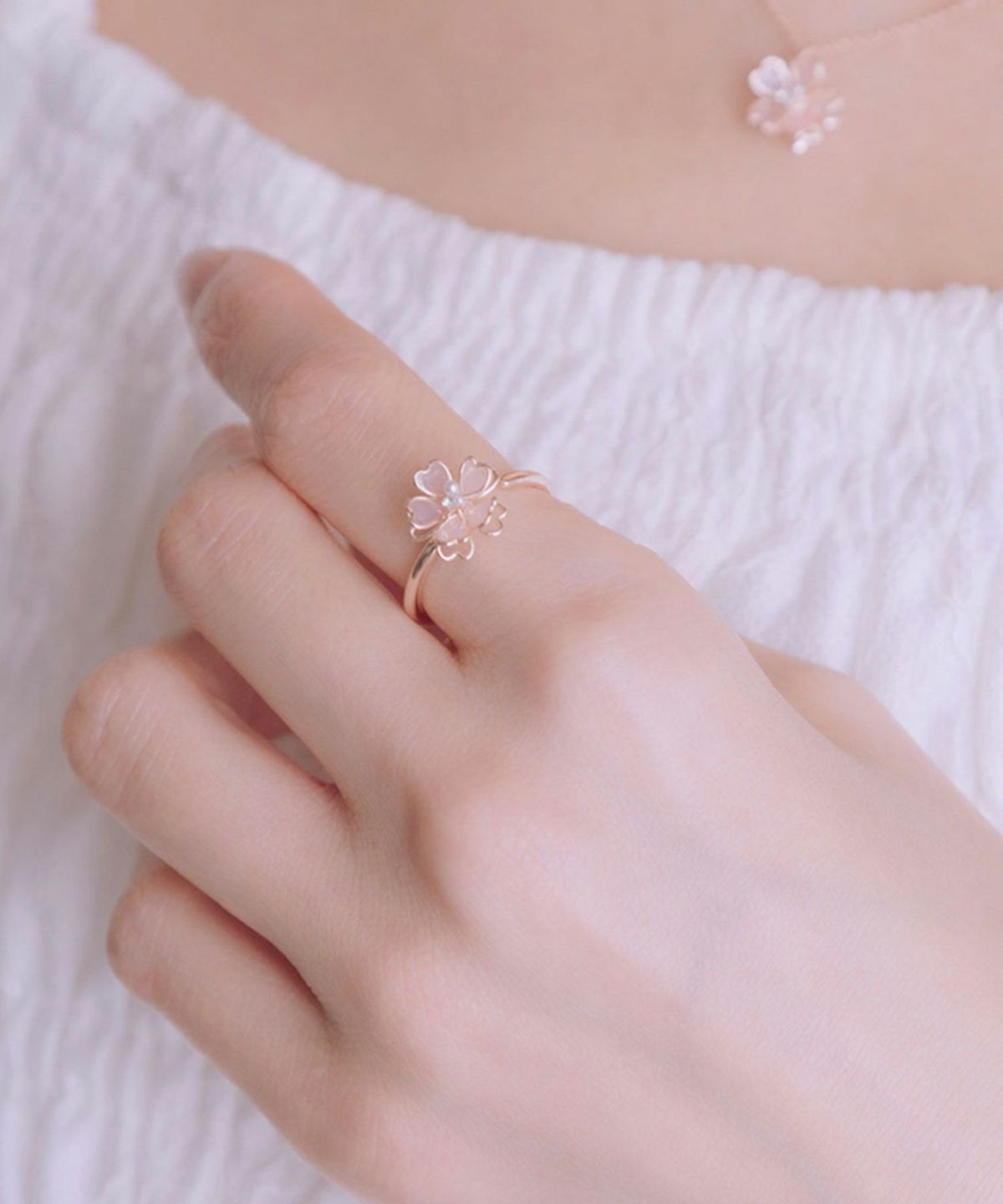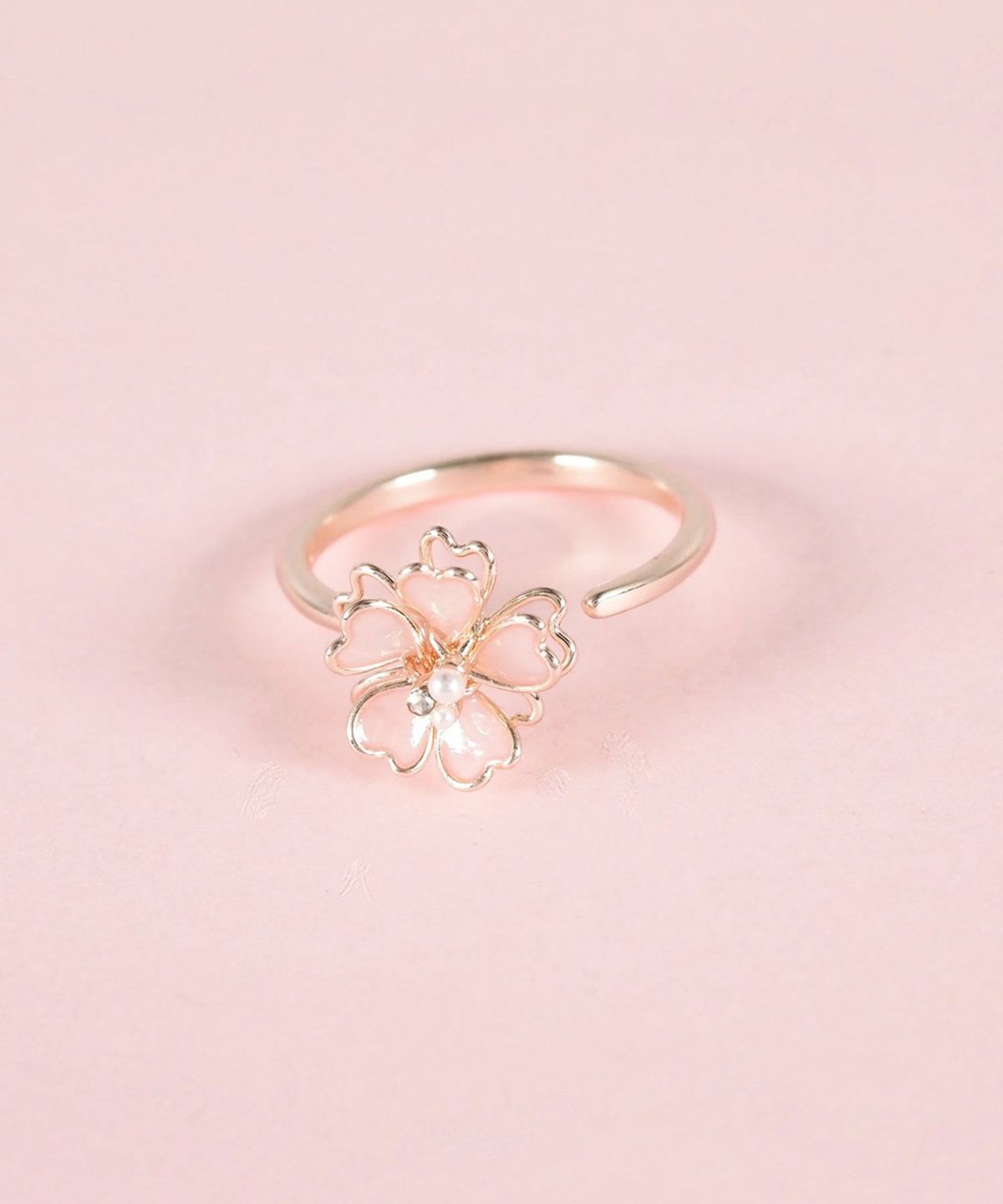 ピンクゴールドのフレームに、透き通るような花びらをあしらった桜(さくら)モチーフリング。立体感のある繊細なデザインが、いつものコーデに上品な甘さをプラスします。控えめながらも華やかな存在感で、デイリーから特別な日のお出かけまで、手元に彩りを添えどんなシーンにも品よく馴染みます。