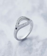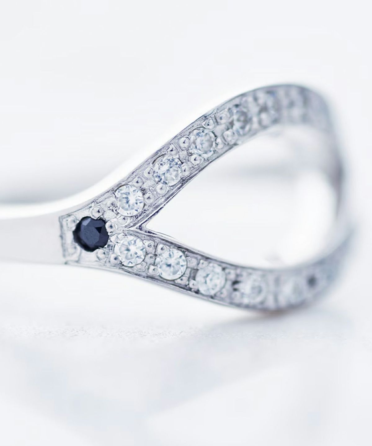 緩やかに湾曲したリング中央の隙間が、さりげなく肌を覗かせながら目を引くデザイン。 片側にあしらったブラックジルコニアが、静かに目を引くミステリアスな雰囲気を添えます。専用のギフトボックス付き。