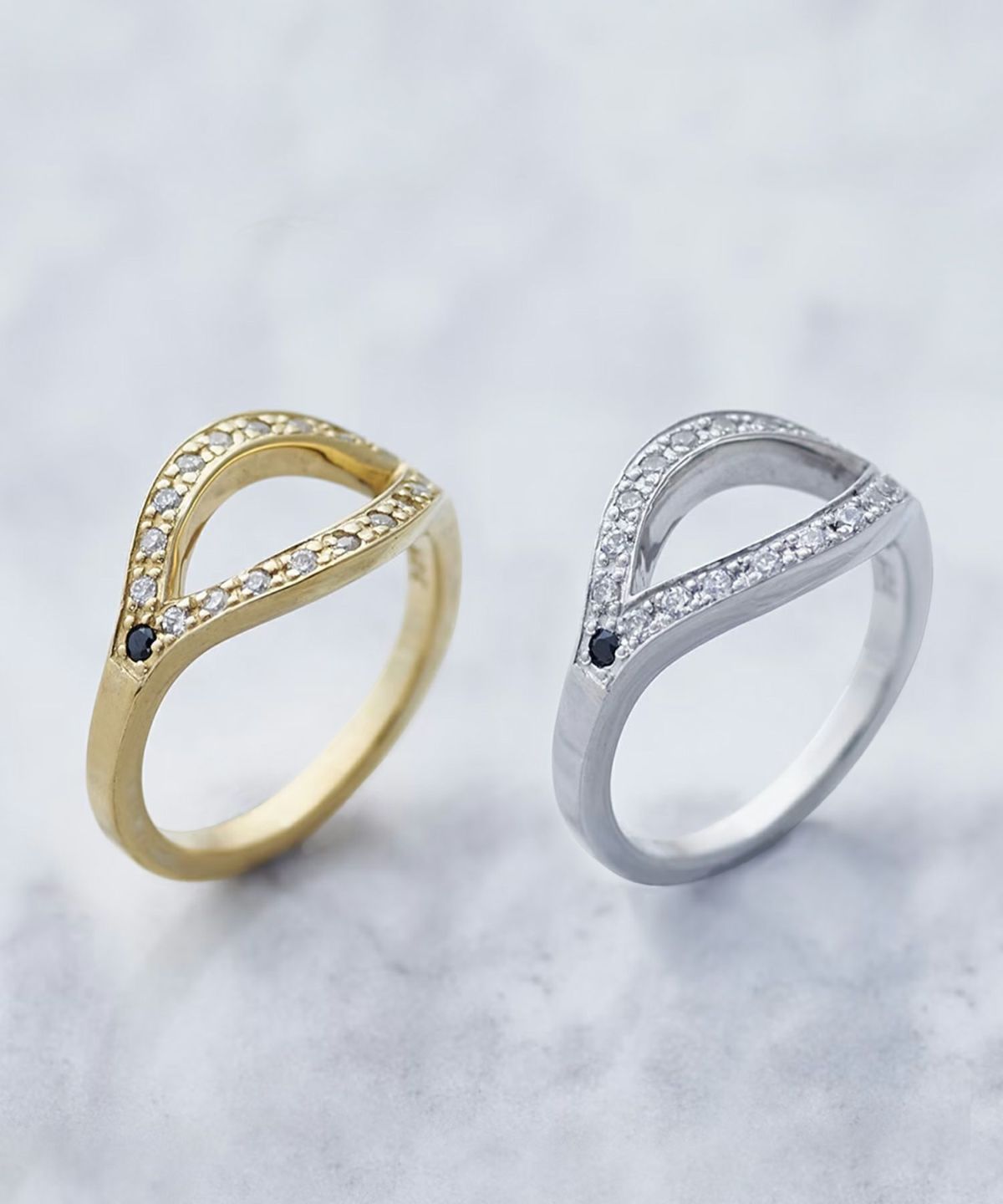 緩やかに湾曲したリング中央の隙間が、さりげなく肌を覗かせながら目を引くデザイン。 片側にあしらったブラックジルコニアが、静かに目を引くミステリアスな雰囲気を添えます。専用のギフトボックス付き。