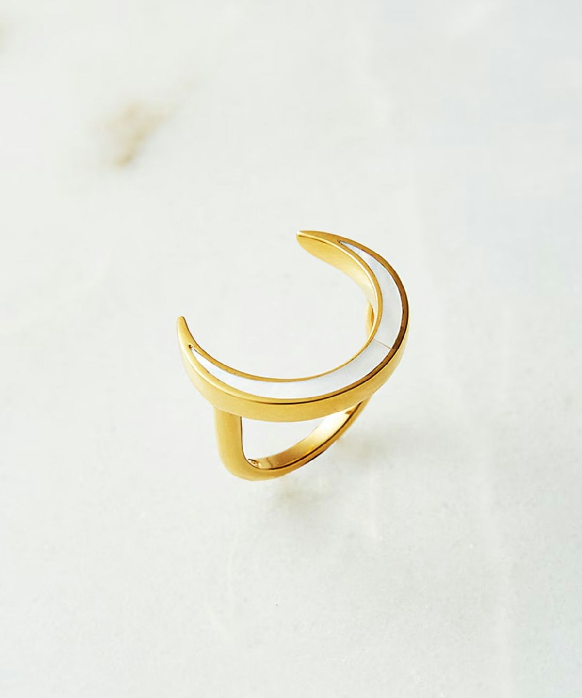 湾曲したシャープな三日月フォルムとシェルが手元をスタイリッシュに演出します。 シンプルな装いに華やかさと個性を添える、大人のためのリングです。専用のギフトボックス付き。