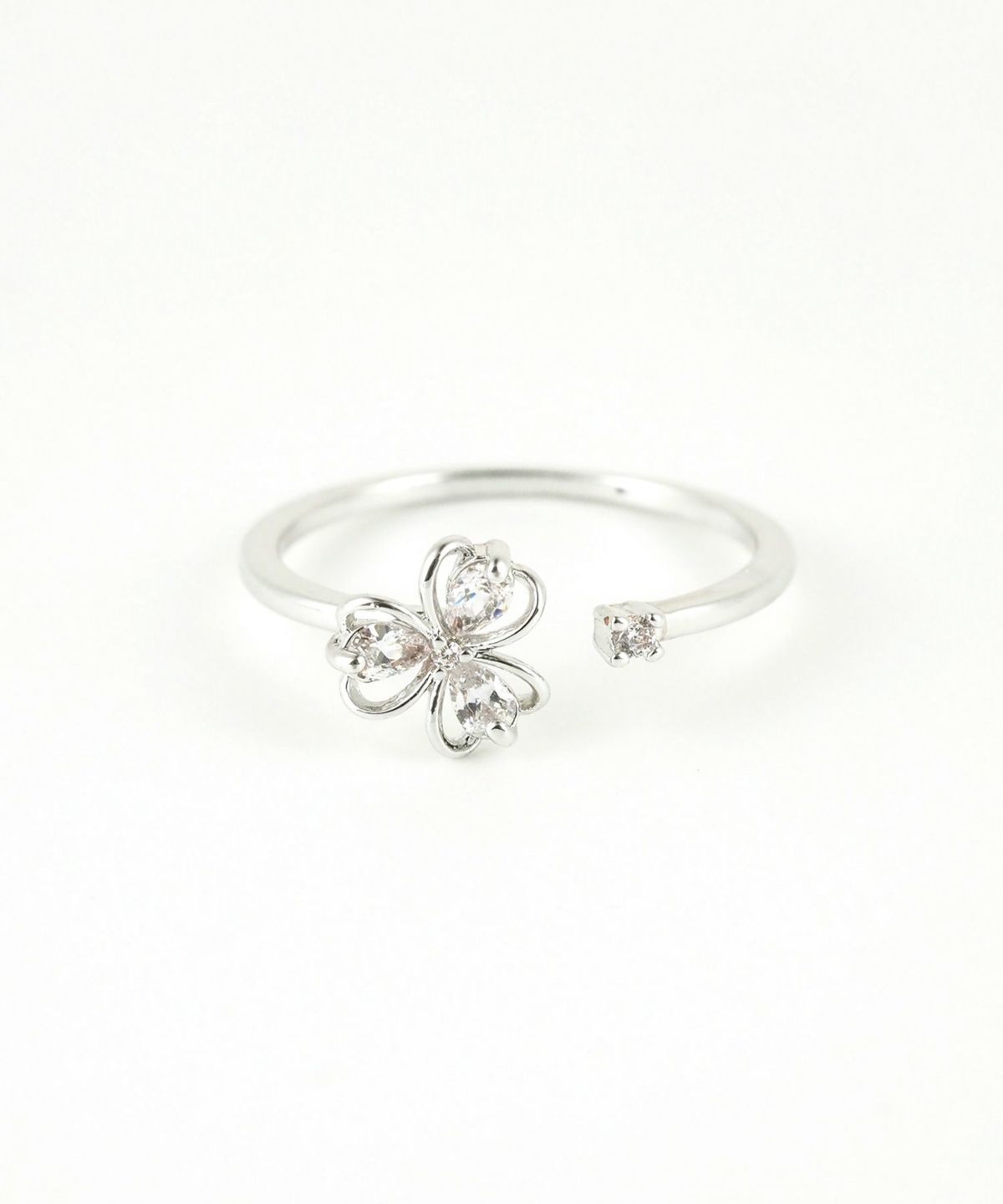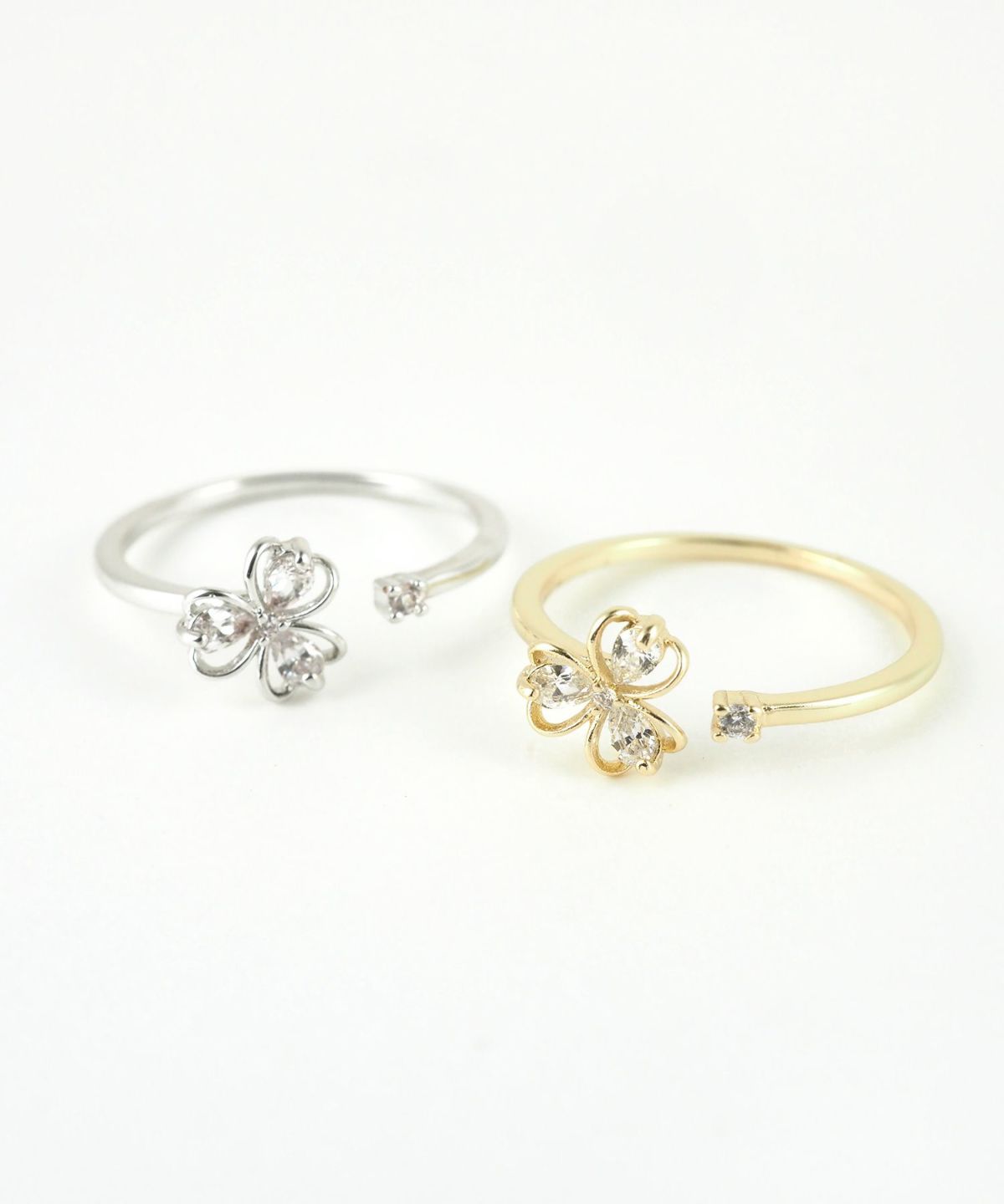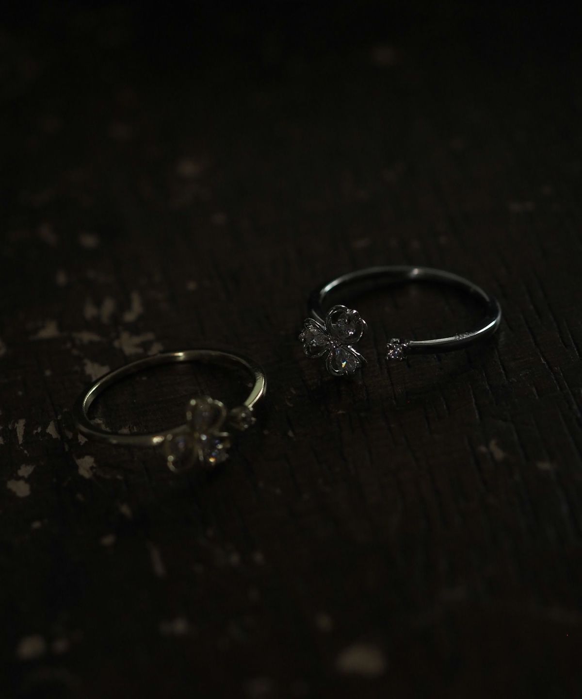 指先を美しく見せる、絶妙なバランスのオープンリング。 ミニマムな三つ葉モチーフと一粒ストーンが、指元に「抜け感」と華やかさをプラスします。 重ね付けもしやすい細身のラインなので、お手持ちのアクセサリーとのコーディネートも自由自在です。
