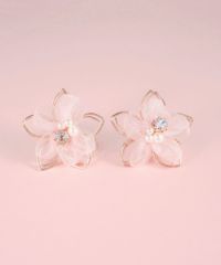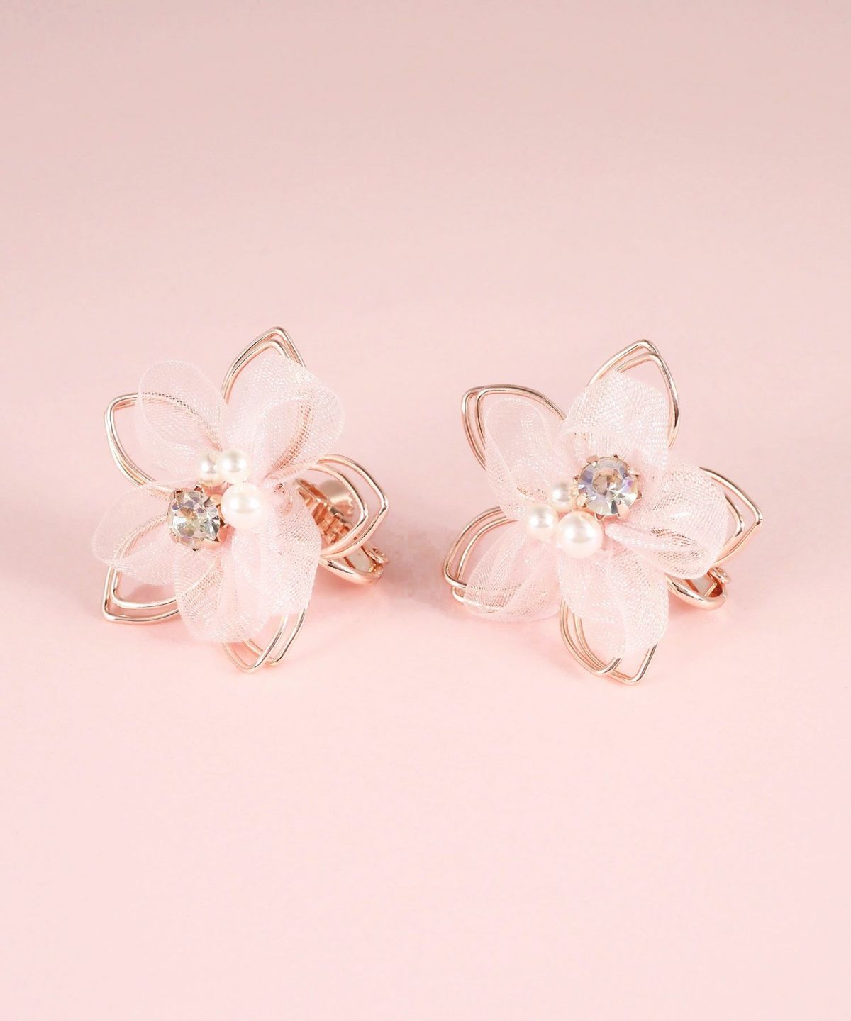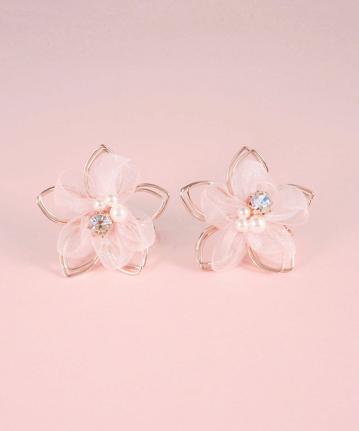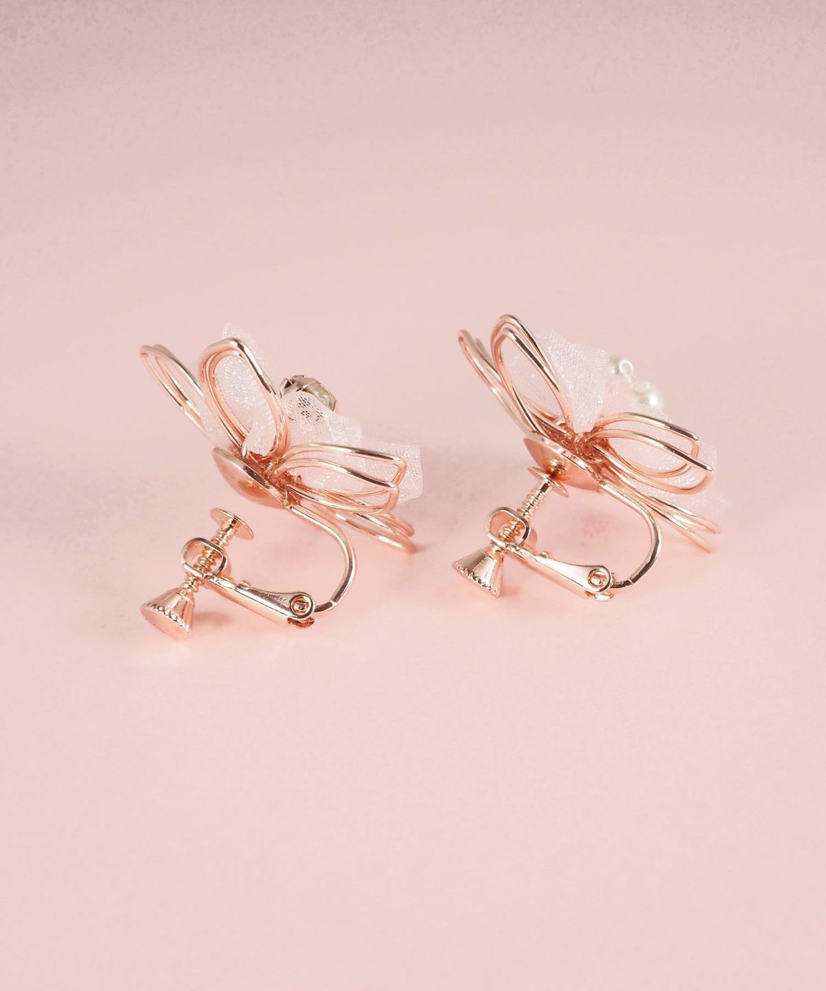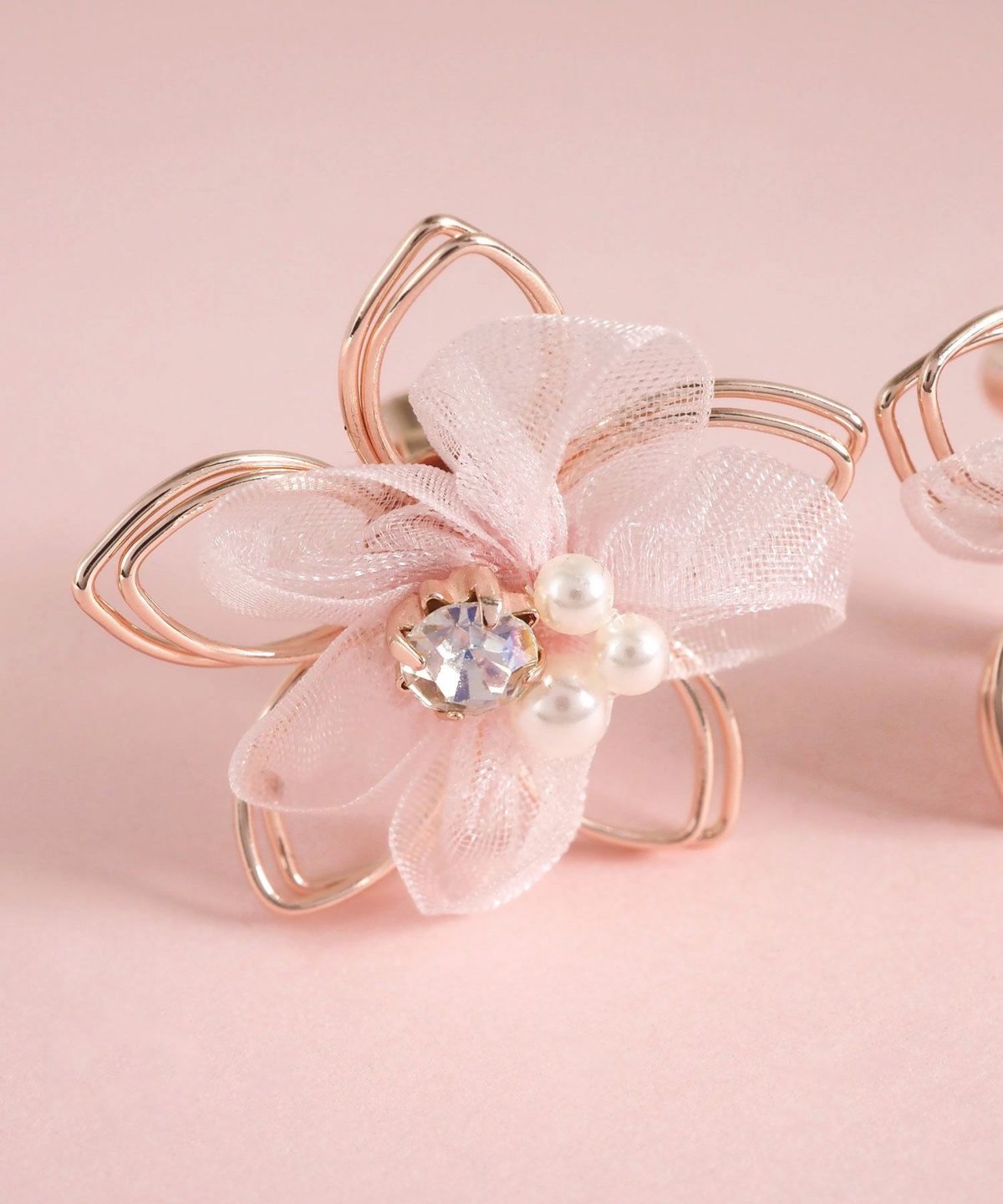 耳元にふんわりと桜(さくら)咲くシアーチュールイヤリング。透け感のある軽やかな花びらを幾重にも重ね、繊細なワイヤーワークで立体感のあるフォルムに仕上げました。中央で輝くパールとビジューが動くたびに上品なきらめきを添え、お顔周りをパッと華やかな印象に。春の装いのアクセントとして、お花見やおでかけにもぴったりのアイテムです♪