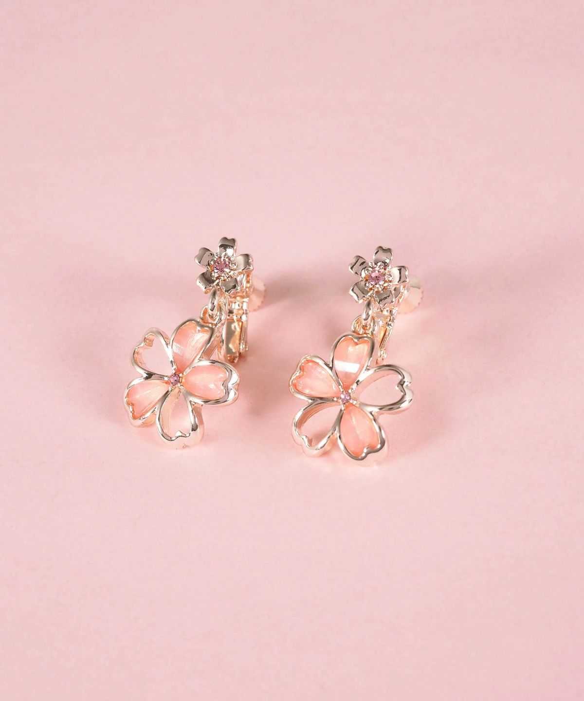 洗練されたメタルラインが描く、淡い桜(さくら)色のトーンが優しげな印象を与えるイヤリング。光に透ける数枚の花弁が春らしい軽やかさとメタルの光沢が横顔を凛と上品に彩ります。卒業・入学・お花見など、春の特別な日はもちろん、日常の装いに可憐な季節感を添えます。