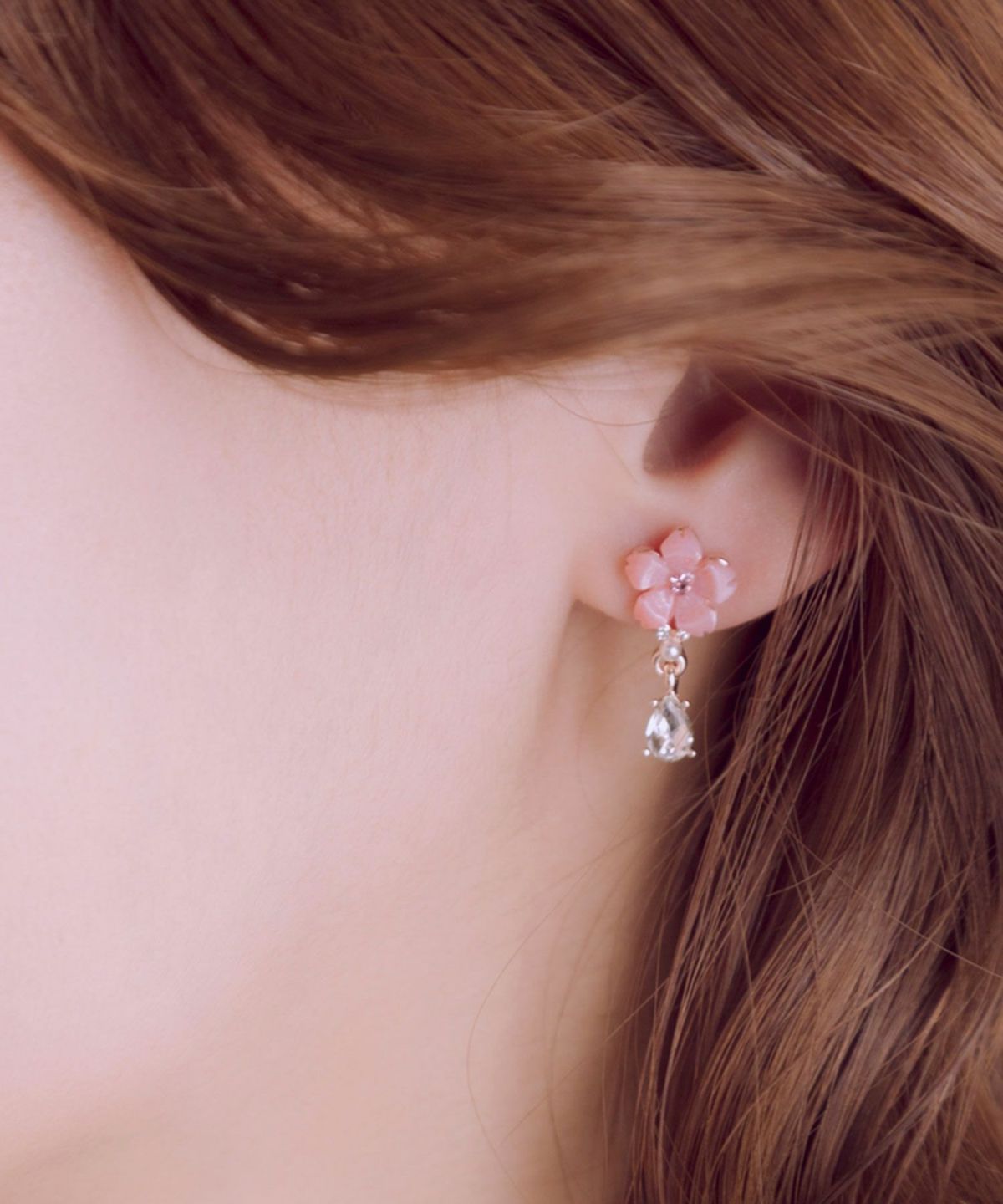 柔らかなピンクの桜(さくら)に、パールとドロップビジューを添えたピアスです。桜(さくら)からしずくが零れ落ちるように垂れ下がったデザインが耳元で揺れるたびに光を集め、お顔周りをパッと明るく見せてくれます。春の訪れと華やかさを添える、特別な日の装いにも日常使いにもぴったりのアイテムです。ペアピアス(両耳用)です。
