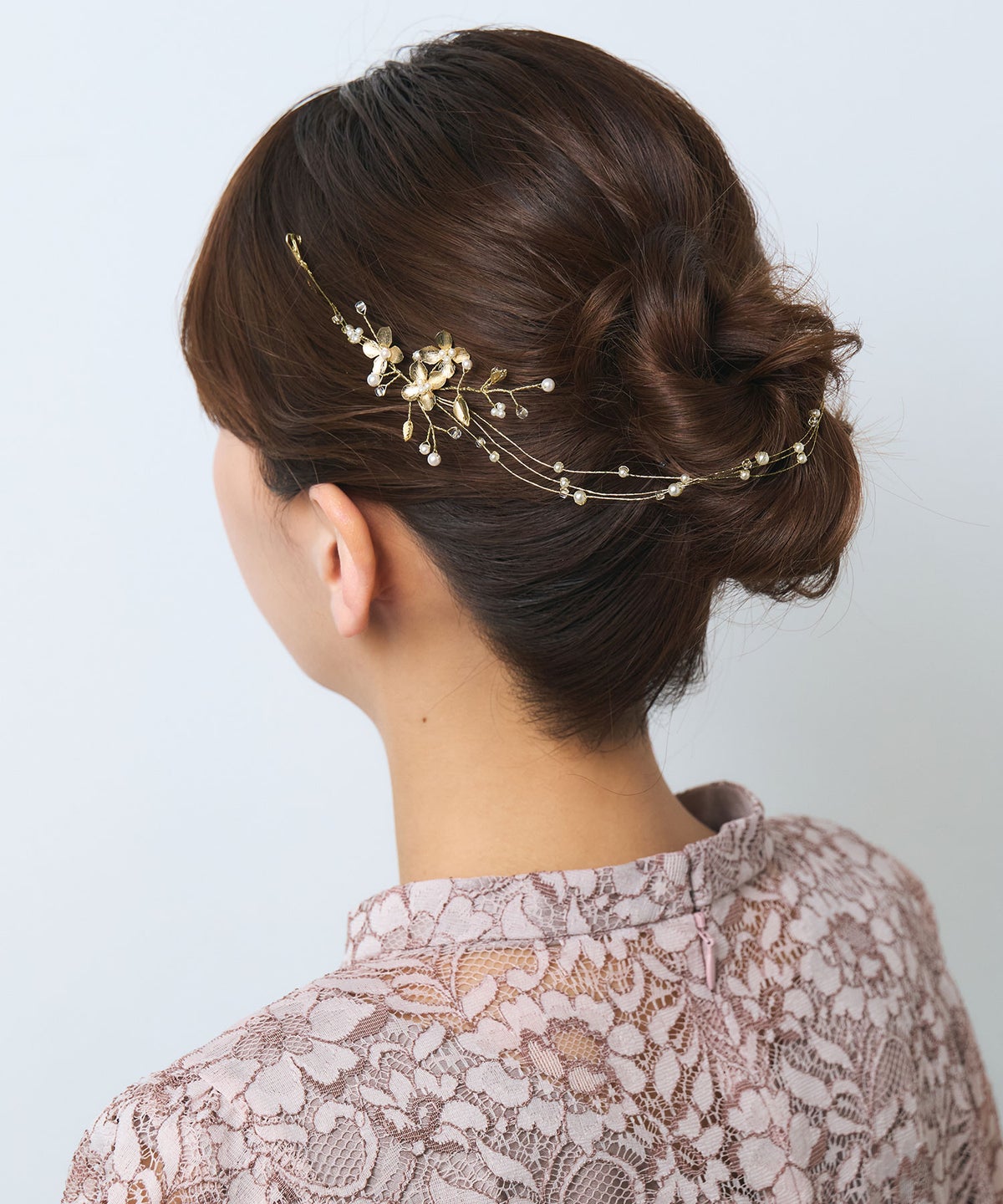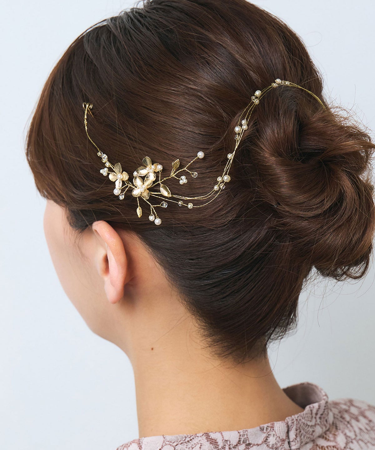 ヘアスタイルを華やかに彩ってくれるヘッドドレス。添えられたメタルフラワーがアクセントとなり、華やかで上品な雰囲気を演出します。 柔らかなワイヤーでできているため、アレンジに合わせて形が変えやすいことも嬉しいポイント。 シニヨンの上にのせたり、お団子に巻いたり、サイドに沿わせたり、複数のアレンジが楽しめます。 結婚式や発表会、舞台などはもちろん、パーティーシーンにおススメです。