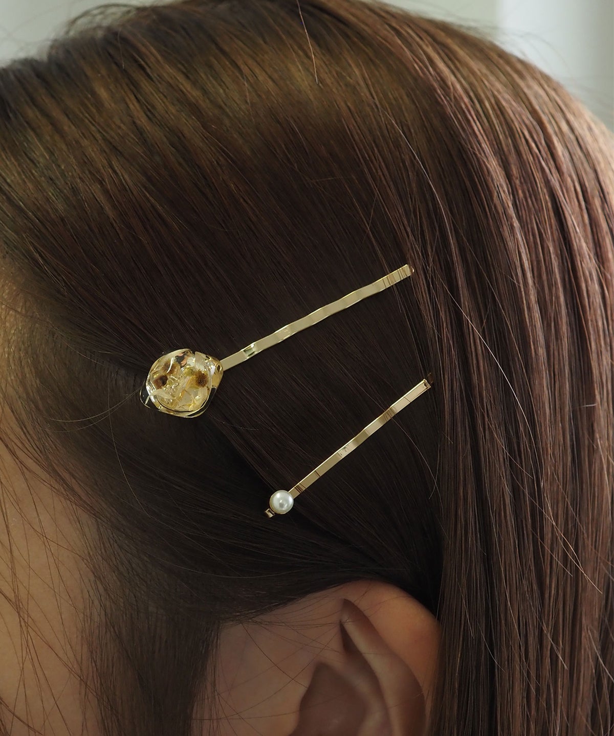 小さなミモザの花々を、ぷっくりとしたフォルムの透明なレジンにそっと閉じ込めたヘアピン。まるで小さなハーバリウムのような繊細で温かみのあるデザイン。光を透過するクリアな質感と、ミモザの柔らかなイエローが、ヘアスタイルを春らしく華やかに仕上げてくれます。お出かけの日にはもちろん、日常に少しだけ「花」を添えたい、そんな気分にぴったりのアクセサリーです。上品な輝きを放つ小粒パールのヘアピンとの2個セットです。