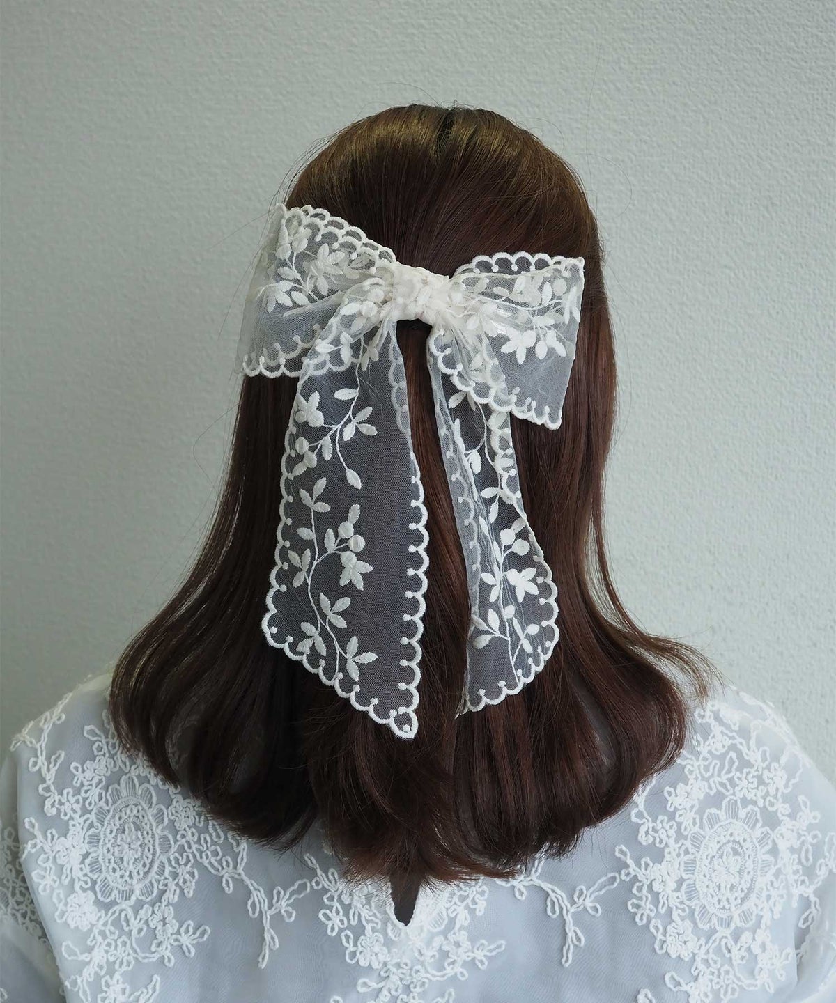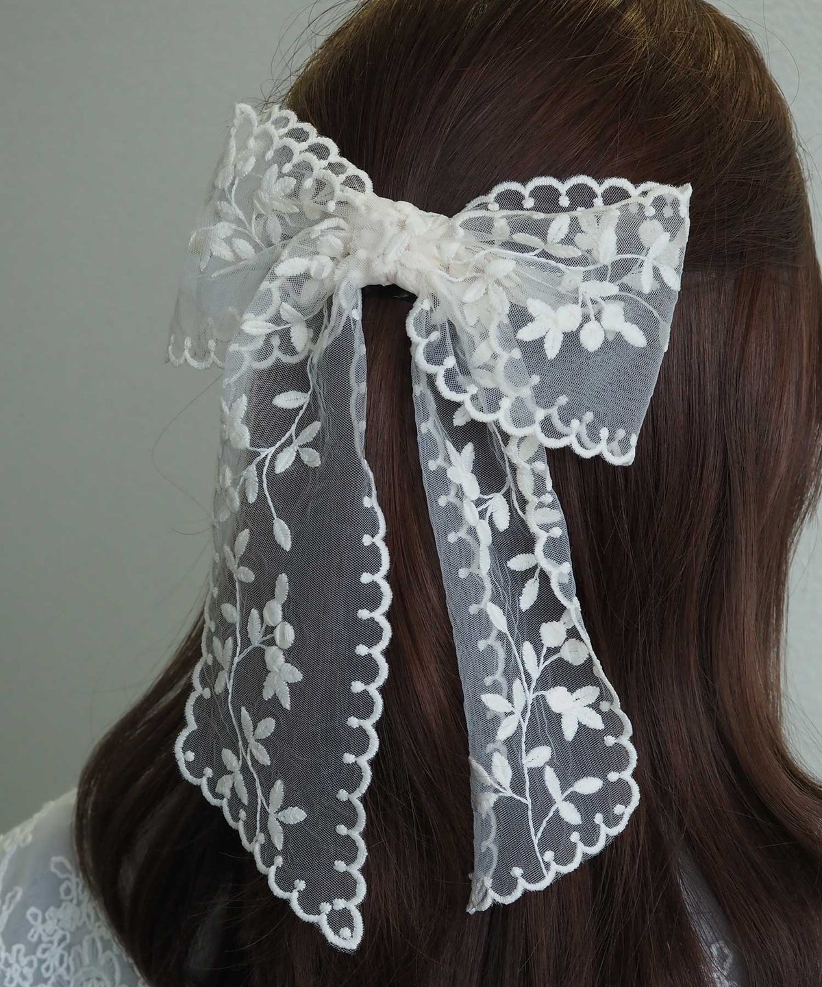 繊細なフラワー刺繍を施したチュールレースを贅沢に使用した、大人可愛い雰囲気のリボンバレッタ。 透け感のあるシアー素材なので、ボリューム感がありながらも重くならず、軽やかで上品な印象を与えてくれます。