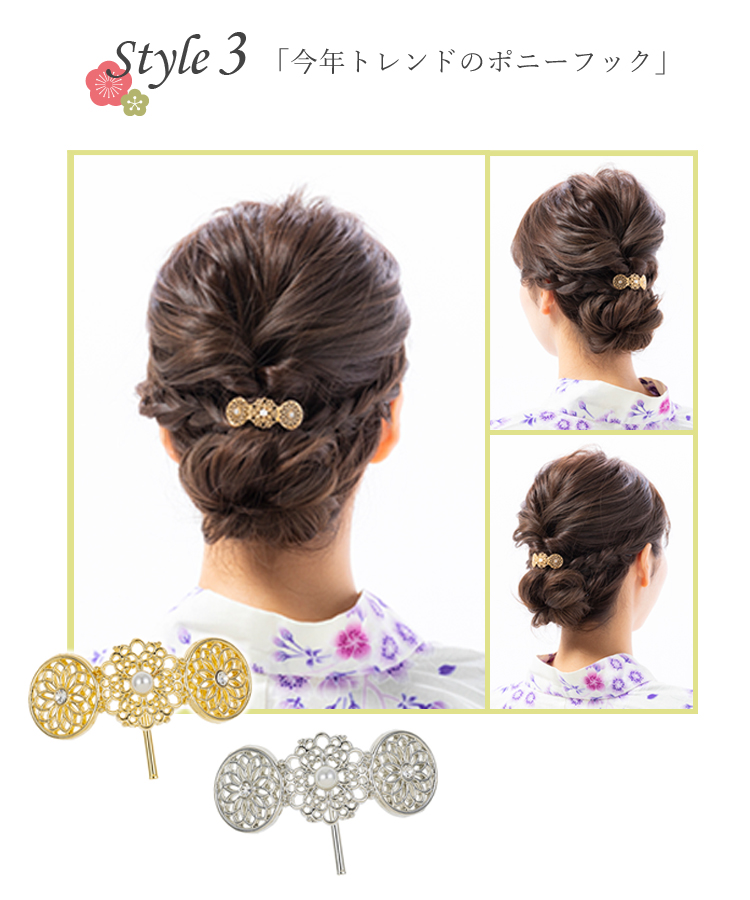 浴衣は一度しか着ないし、ヘアアクセサリーを買うなら普段も使えるものがいい…という方におすすめなのが、今年トレンドのポニーフック。浴衣のアップスタイルにもぴったりで、日常でポニーテールをしたときにも使えます。