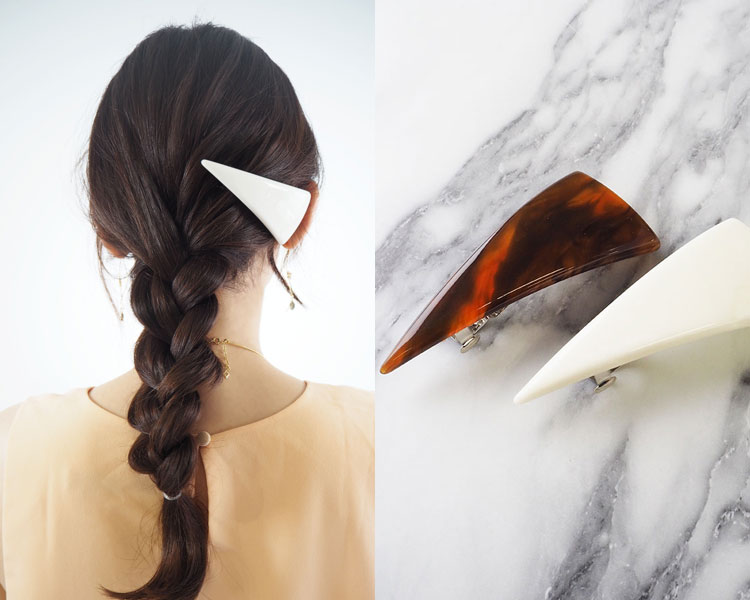 シンプルなカラーで大きめの三角バレッタを選べば、一気に華やかさとモードな印象を感じさせてくれますよ。