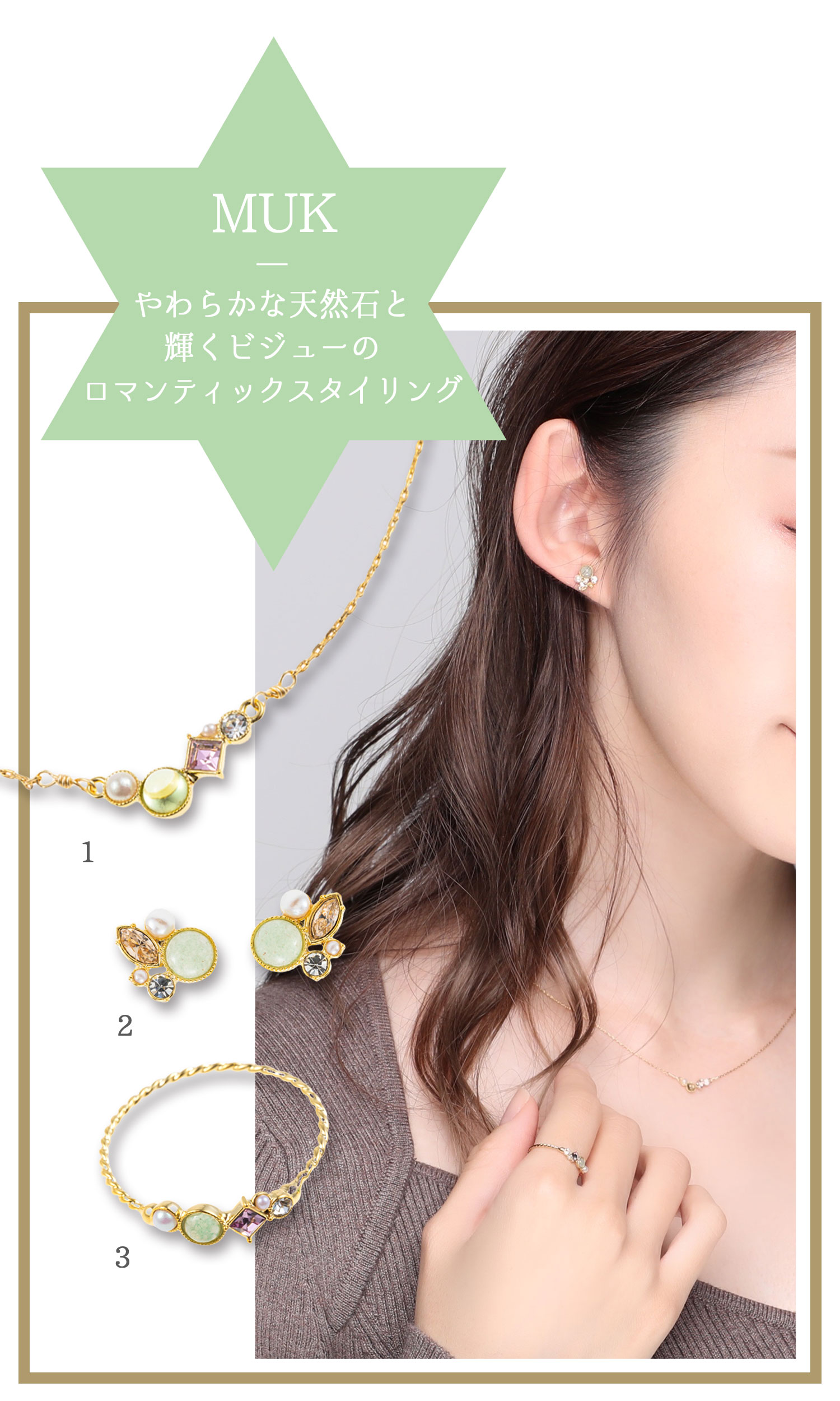 3)ナチュラルストーンとビジューのリング(アベンチュリン)/1,980円 ≫