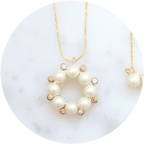7.優しさあふれるサークルモチーフ。ストーンのホワイト&ピンクの愛らしいカラー使いにきゅんです。[パールリングネックレス【MUK voyalibre】1,980円] |