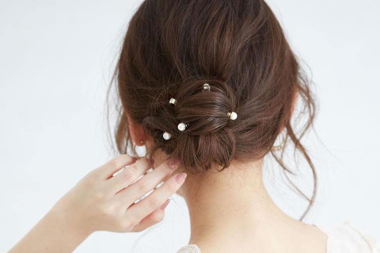 トレンドのヘアビジューもおすすめです。つけたい場所に、軽く押し当てながらくるくると巻きつけるだけです。お団子スタイルにパールを散りばめるだけで、手の込んだアレンジに見えますね。
