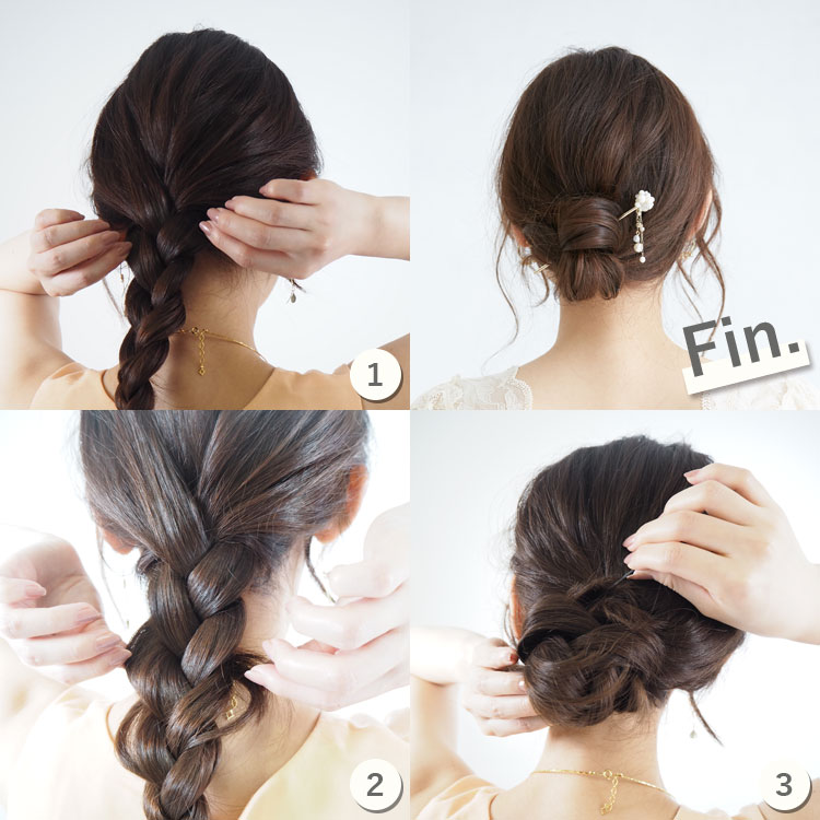 低めの位置で三つ編みをし、毛を引き出します。三つ編みを根本にぐるっと巻き付けてヘアピンで固定。最後にコームをさっと挿し込むだけで完成! コームならセルフでも簡単に付けられて、一見難しそうに見えるまとめ髪にアクセントを与えてくれます。
