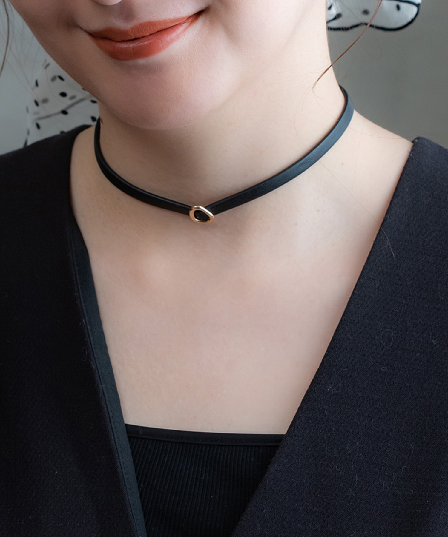 首元の空いたV字のトップスにはチョーカーで華やかさをプラスしてみて。
