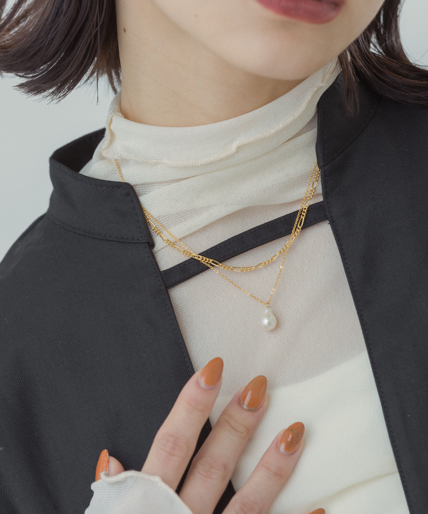 首元が詰まって重たい印象にならないように、華奢なものを選んで。