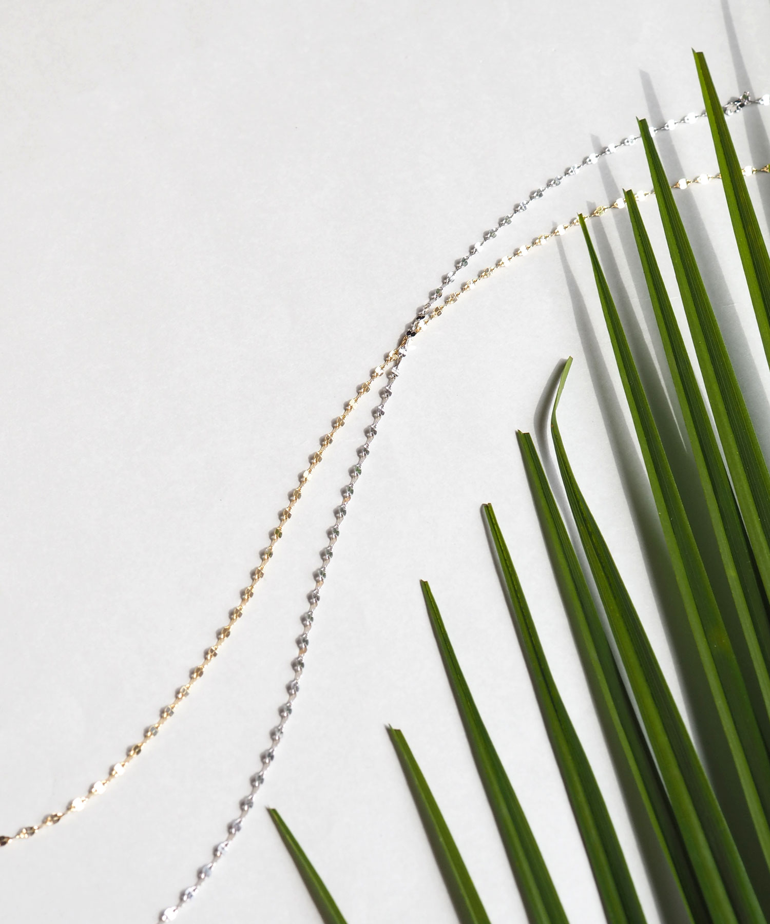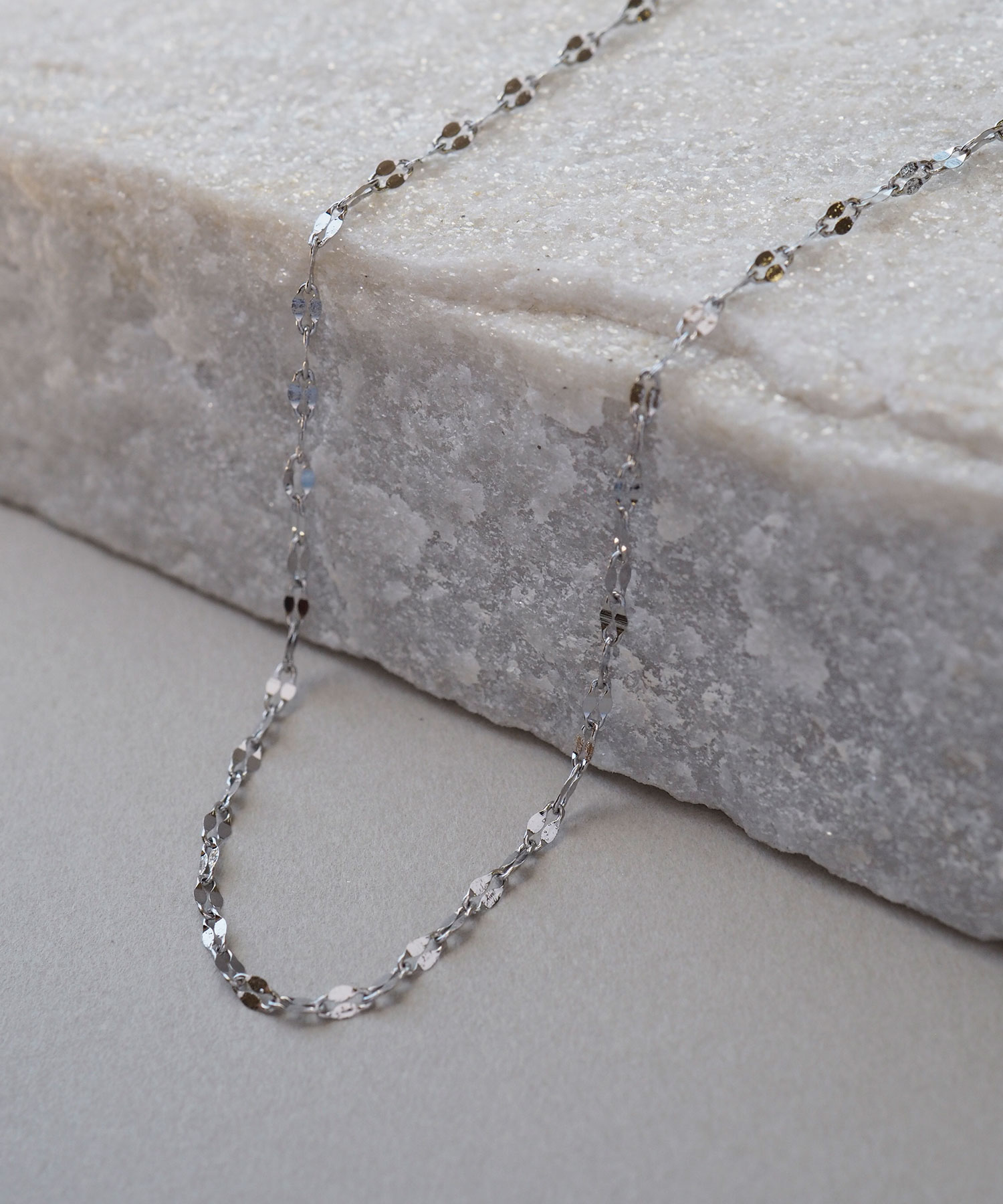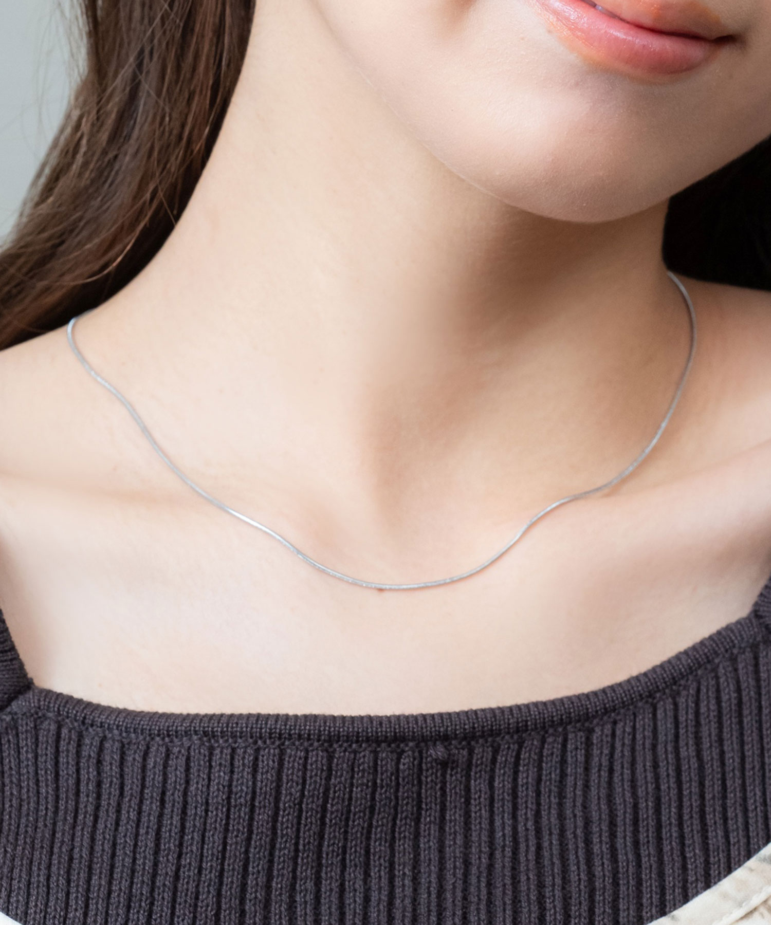 すっきりとした印象のスクエアネックには、短めのチェーンがおすすめ。