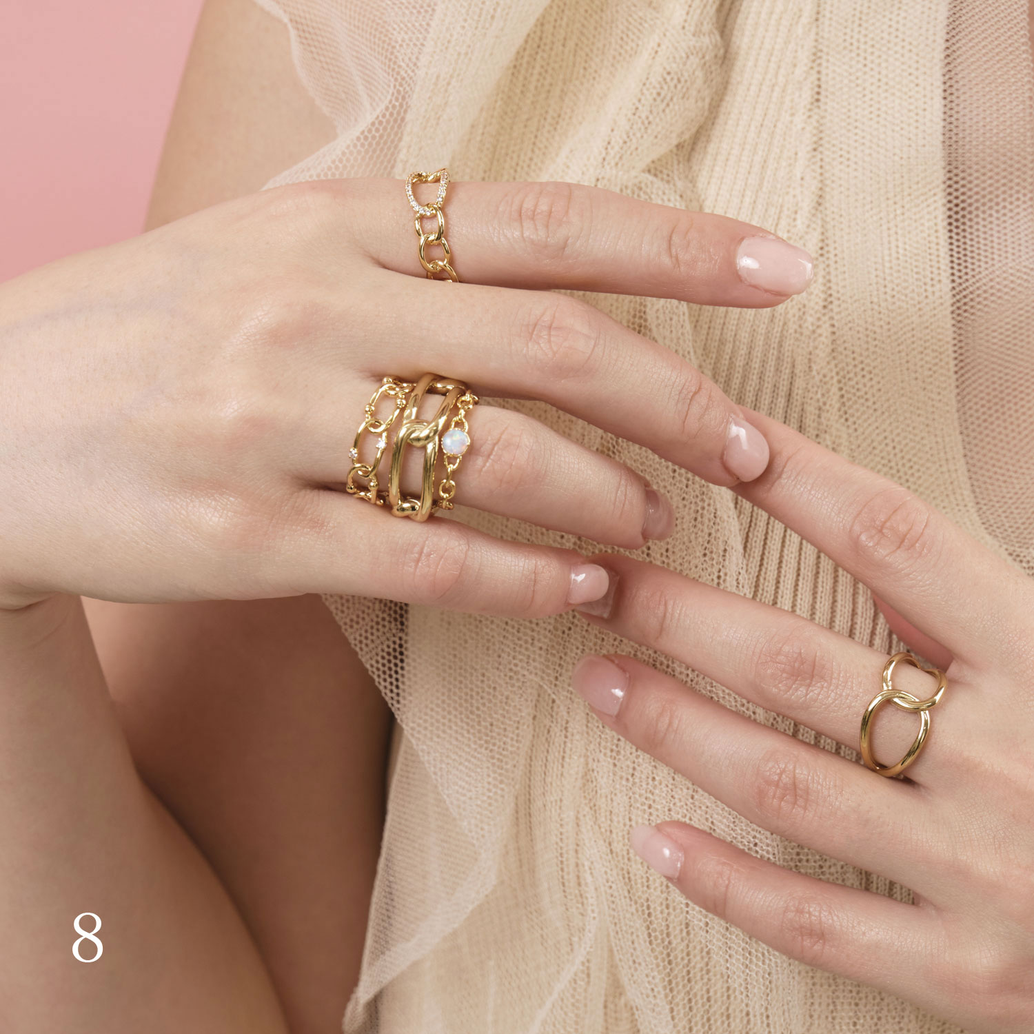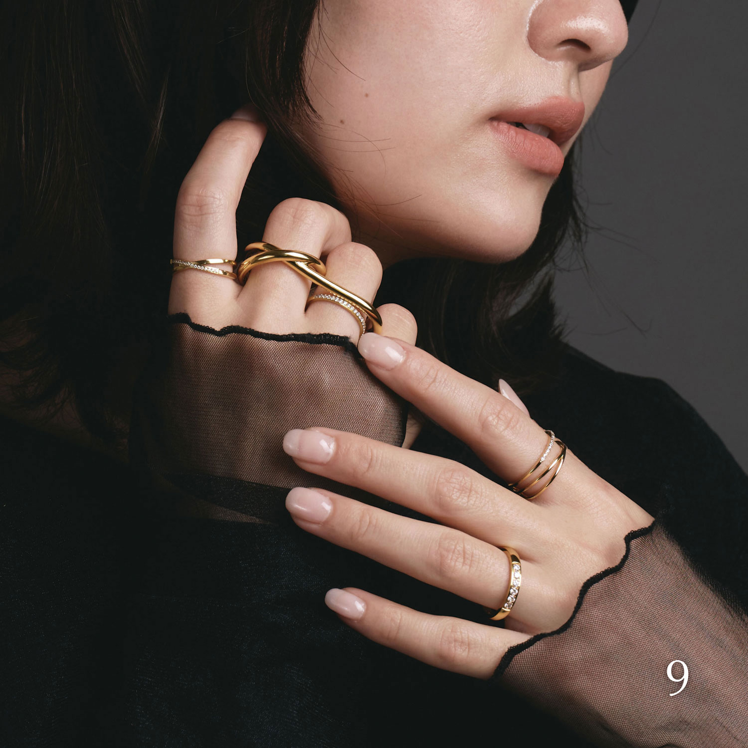 デザインや太さの異なるリングをたっぷりと重ね付け。直線的なデザイン、曲線的なデザイン、カラーストーン…と、テイストを揃えればジャラづけもまとまります。
