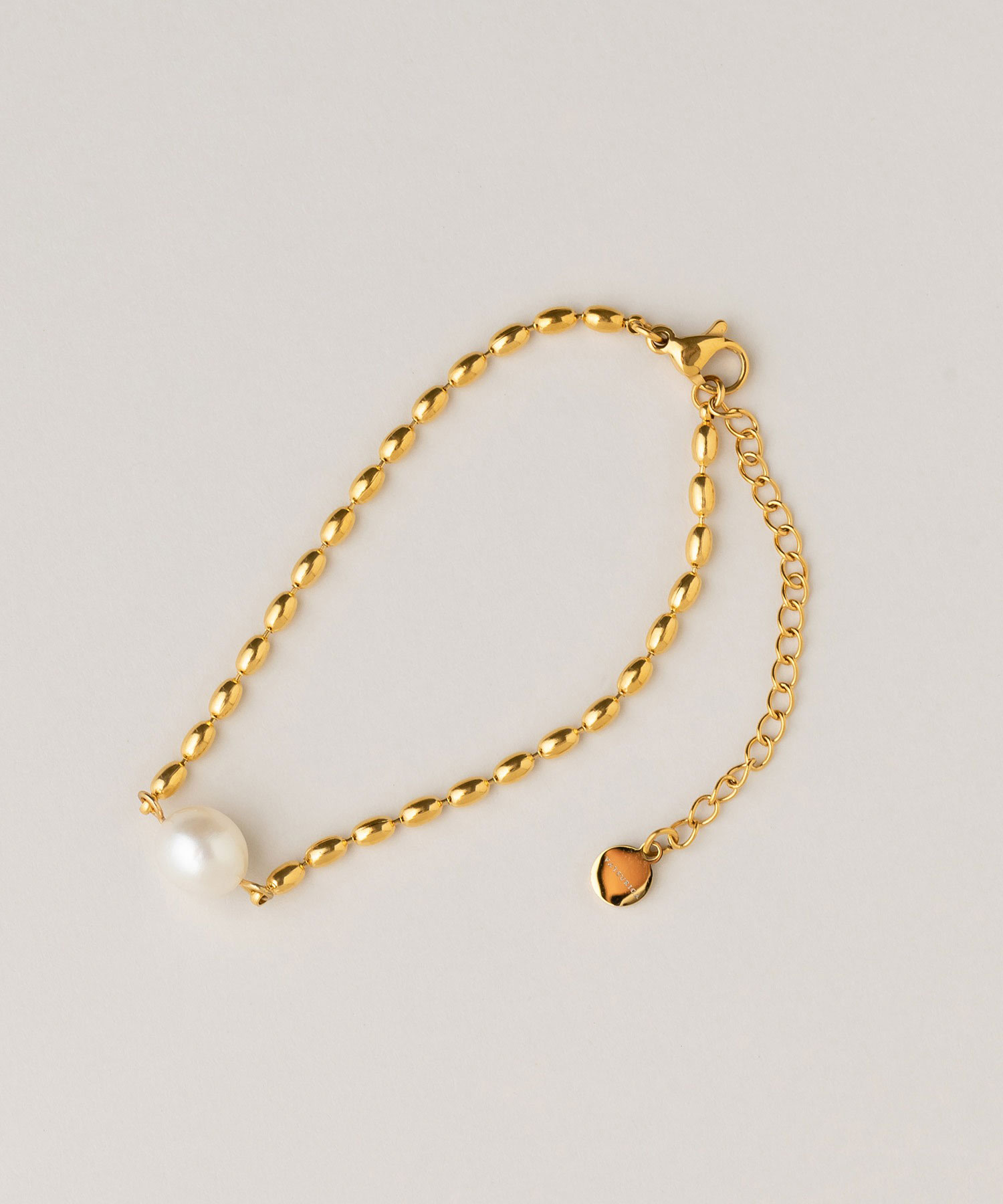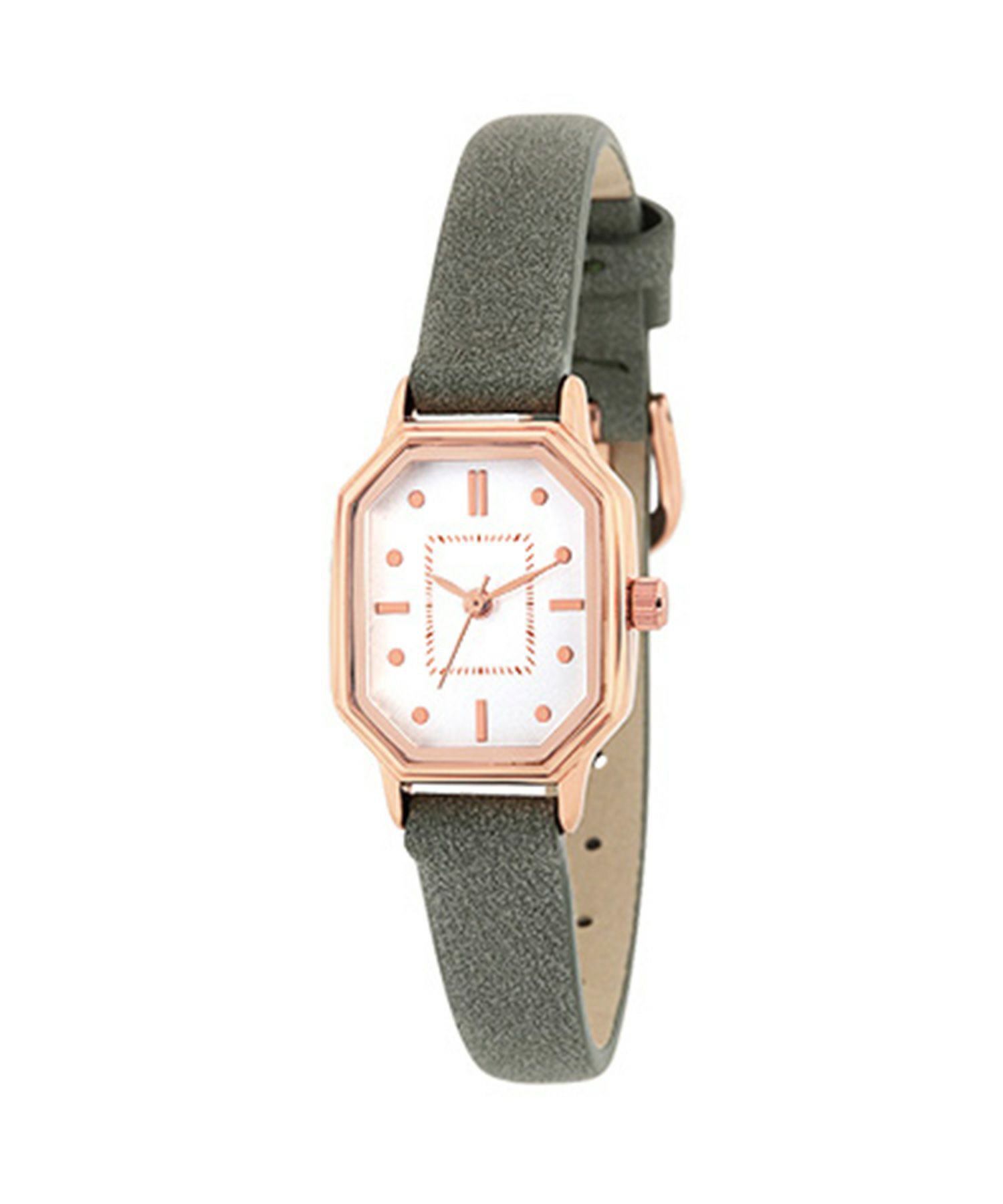 クラシカルなグリーンの時計には、パールブレスがマッチ。