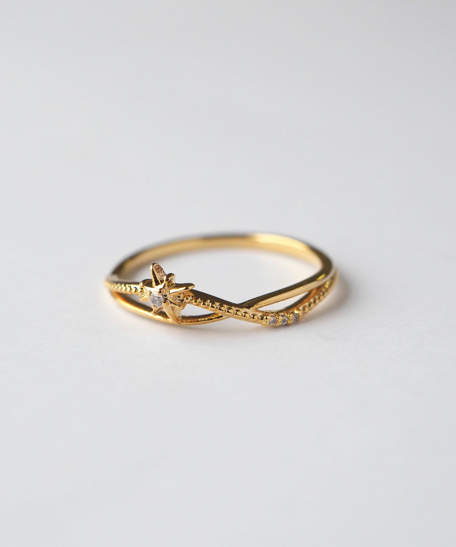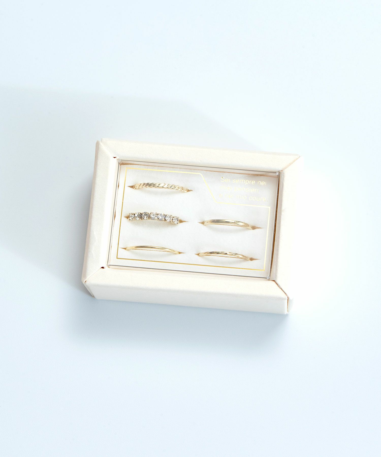 ビジュー輝くセットリングが女性らしさと華やぎをON。肌にすっと馴染むのにシーンを選ばないからオフィスにもぴったり。