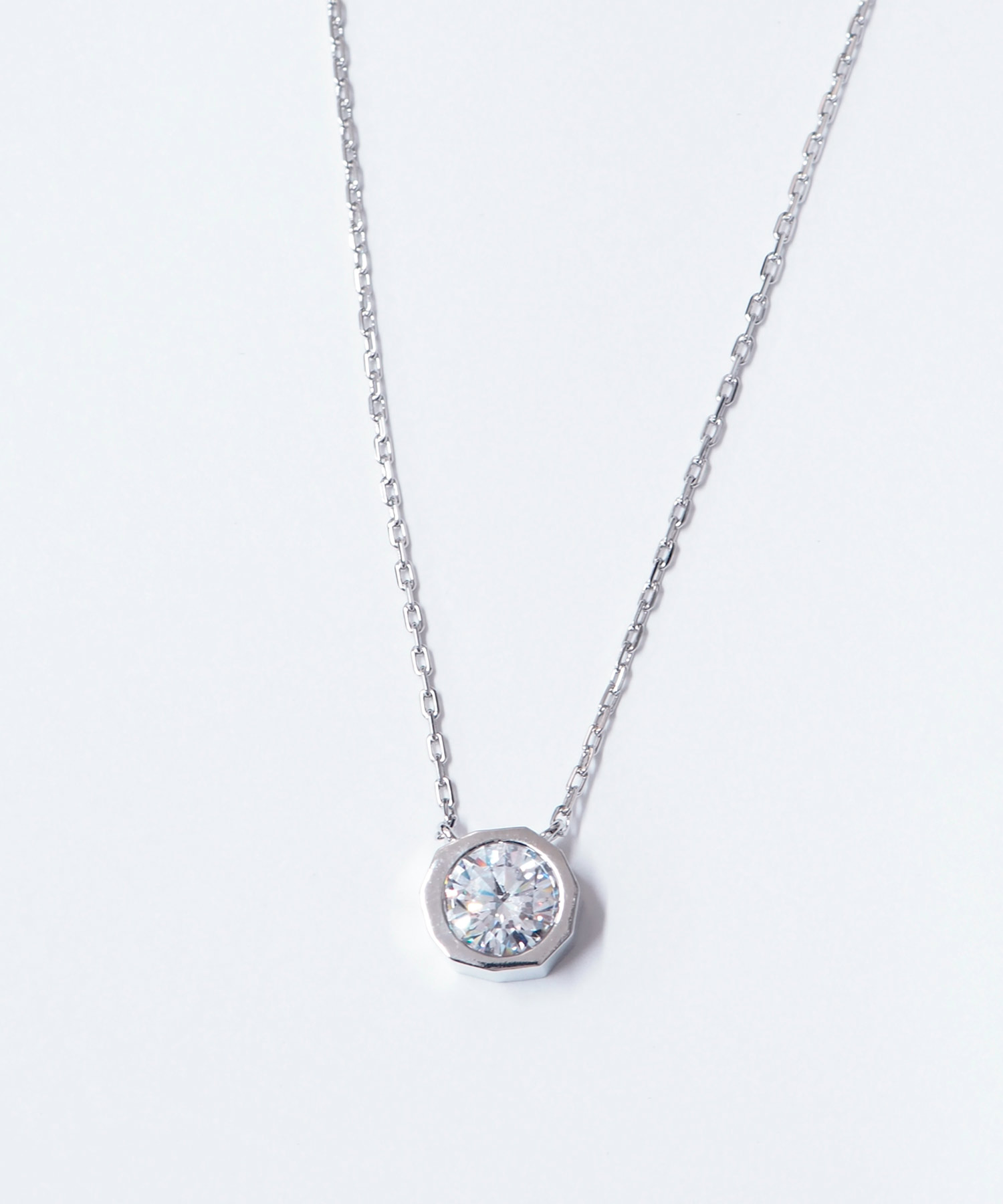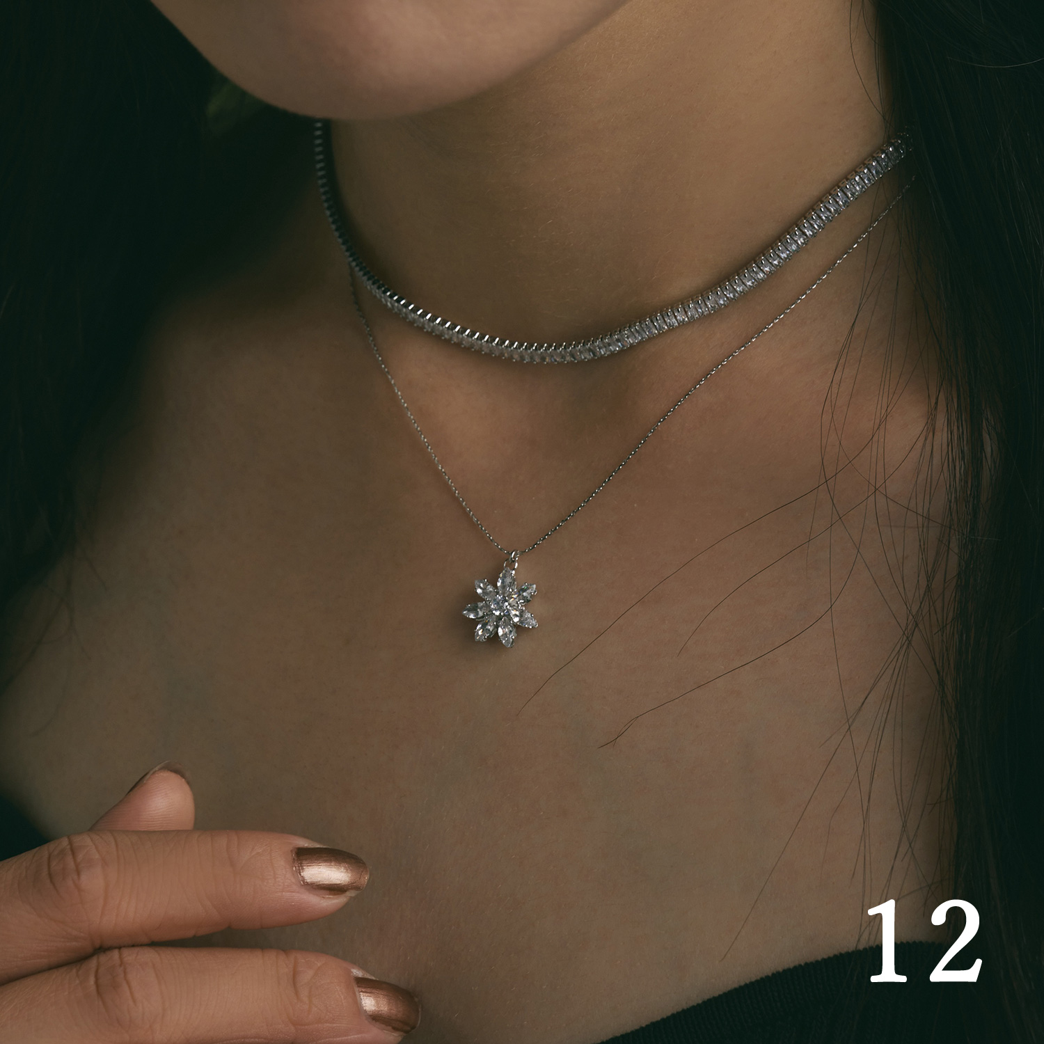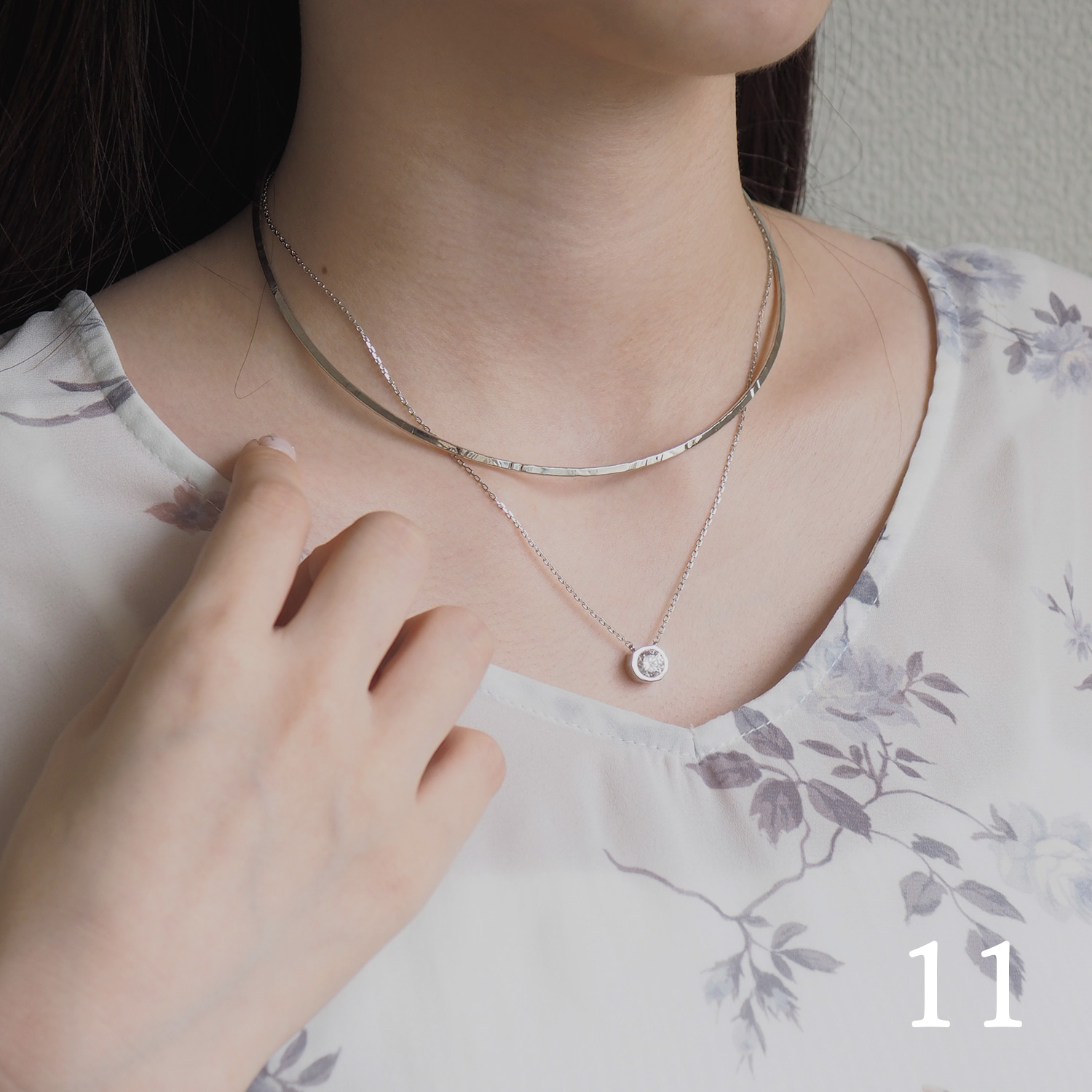 首に沿う長さのチョーカーとVラインを描くペンダントネックレスを組み合わせれば、レディライクな首元コーデが完成します。