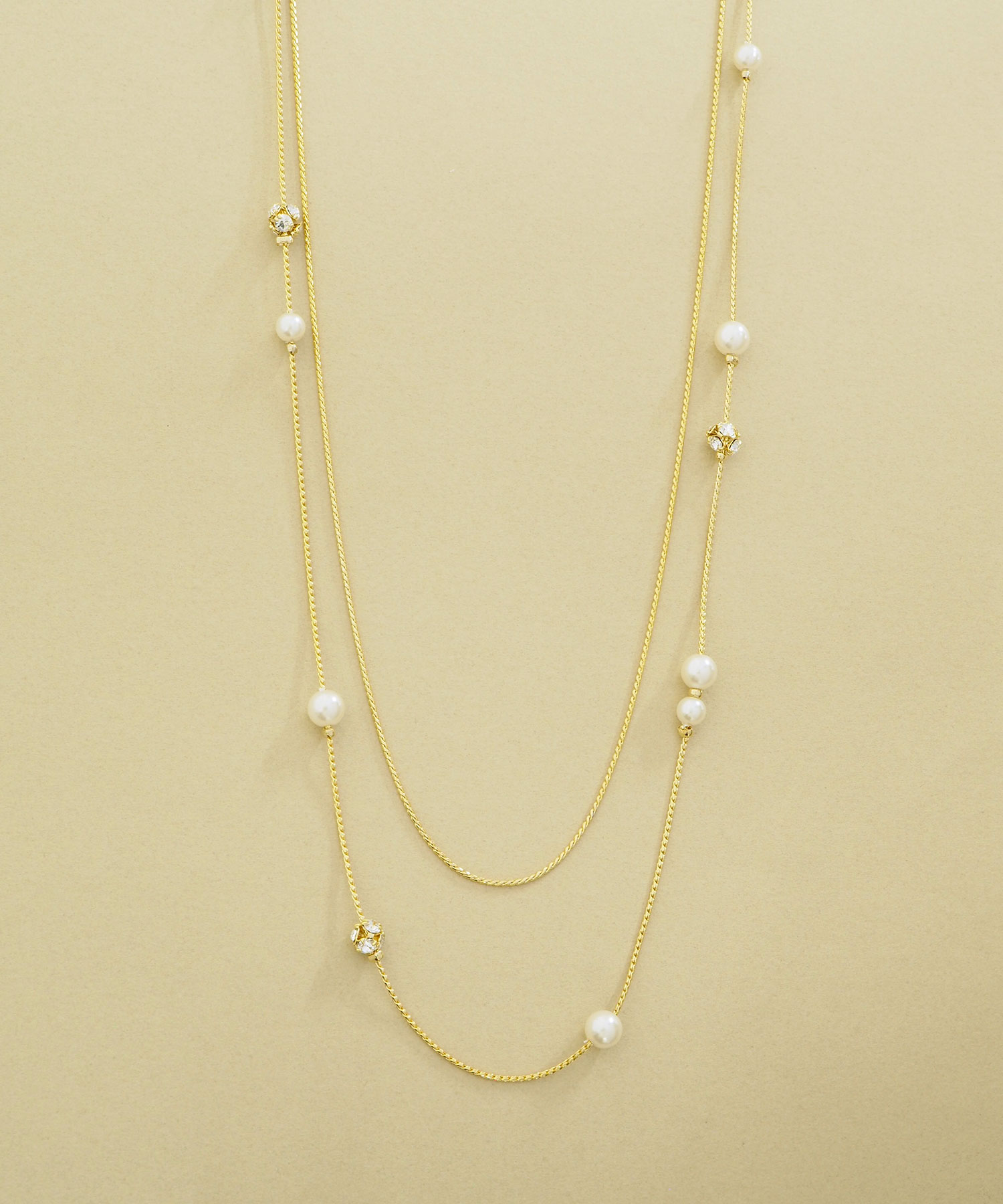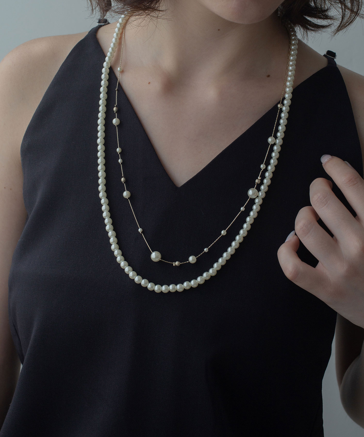 パールがぎっしり並んだデザインと間隔の空いたデザインのネックレスをレイヤードすると、こなれ感のあるスタイルに仕上がります。