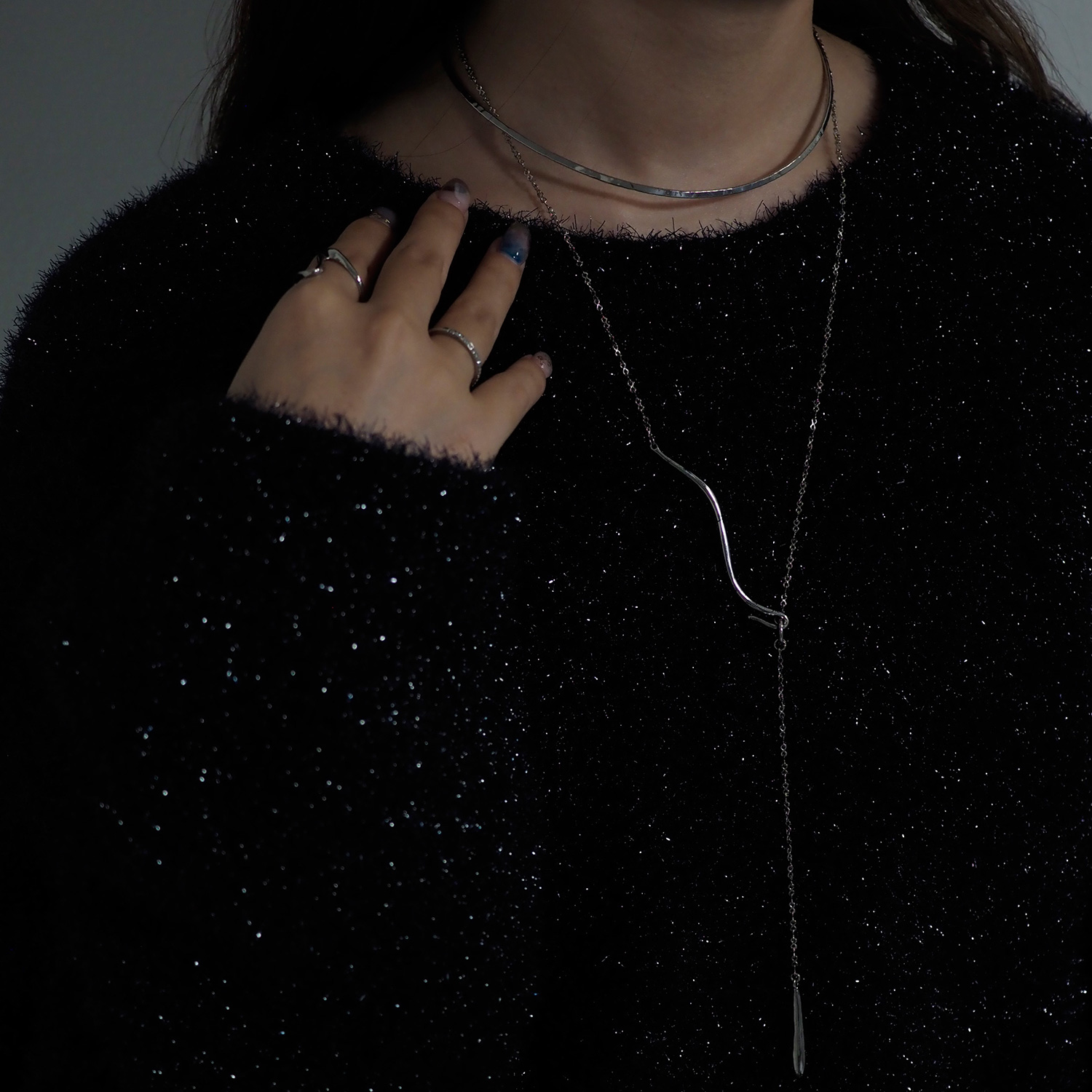 シルバーメタルのアクセサリーには、トレンドのラメ感のあるトップスがおすすめ。