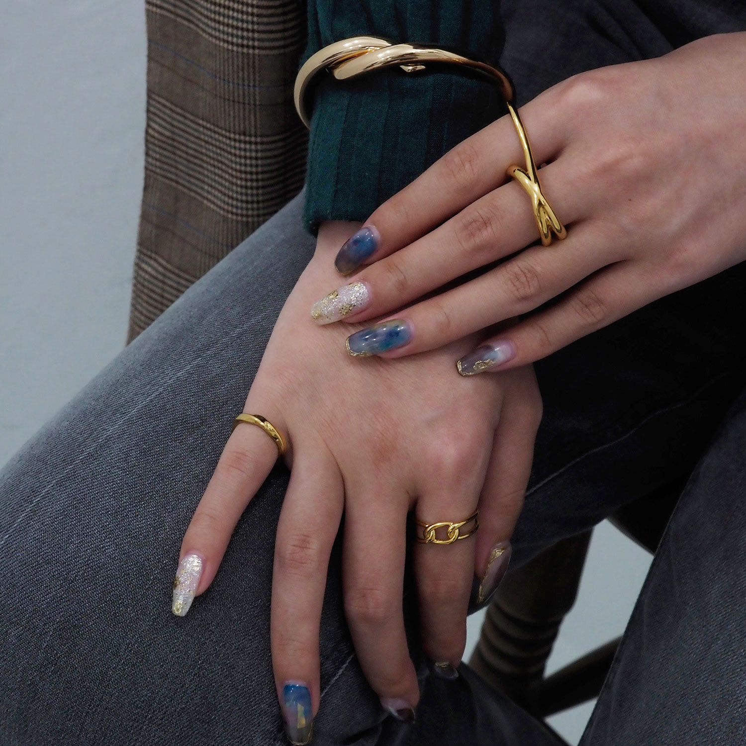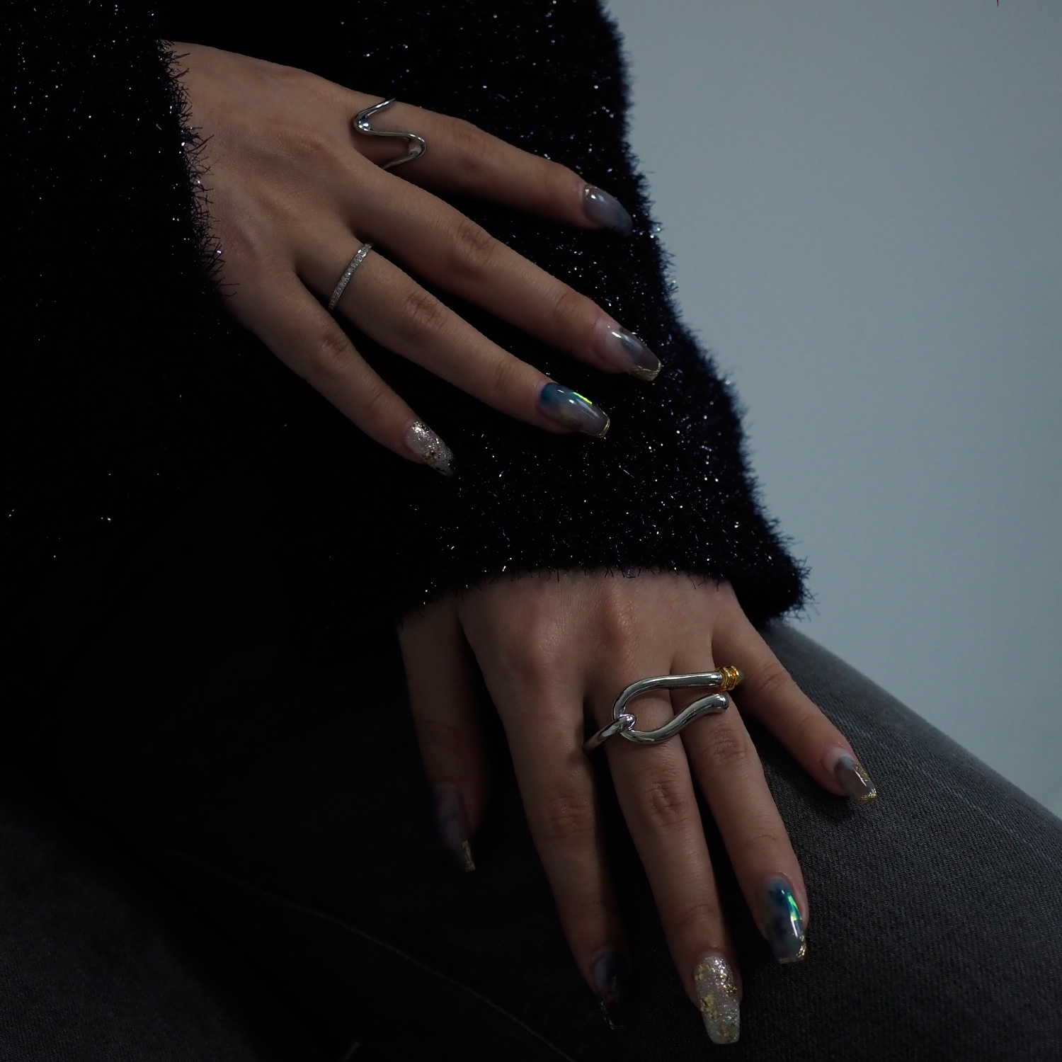 ゴールドとシルバーをミックスしたリングをチョイスすると、おしゃれ度がさらにUPします。