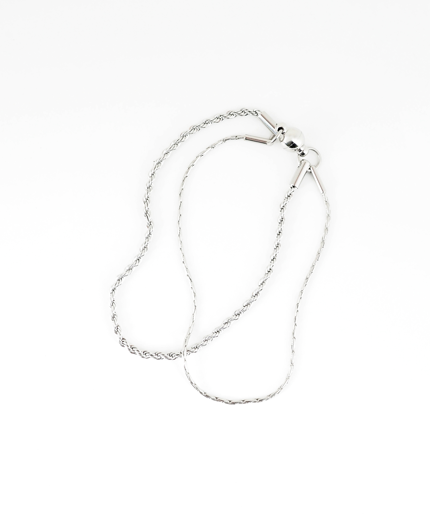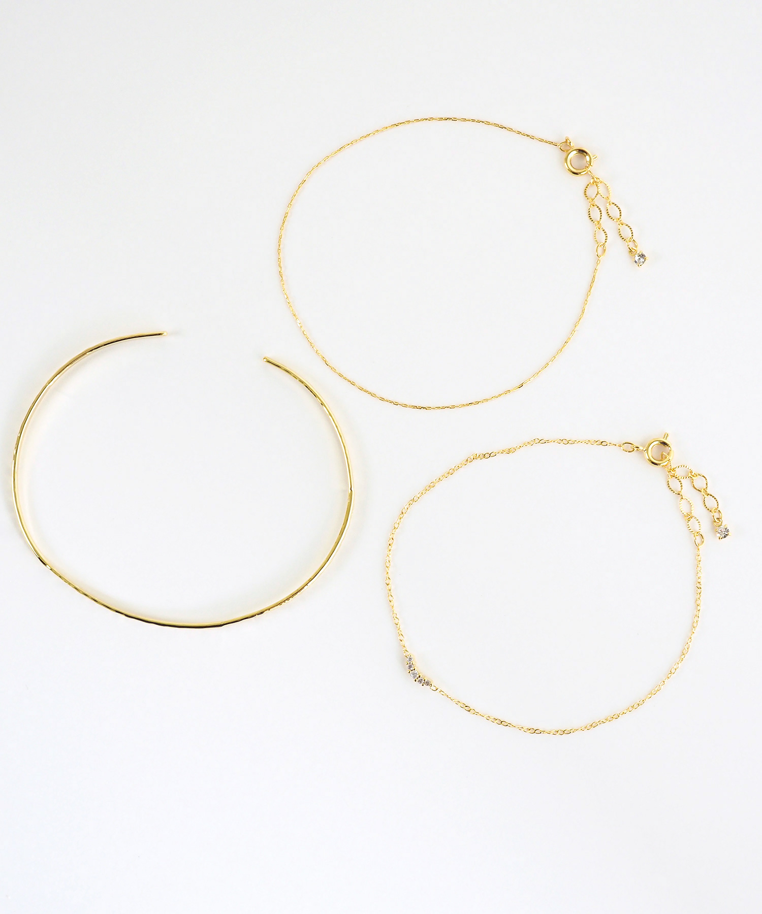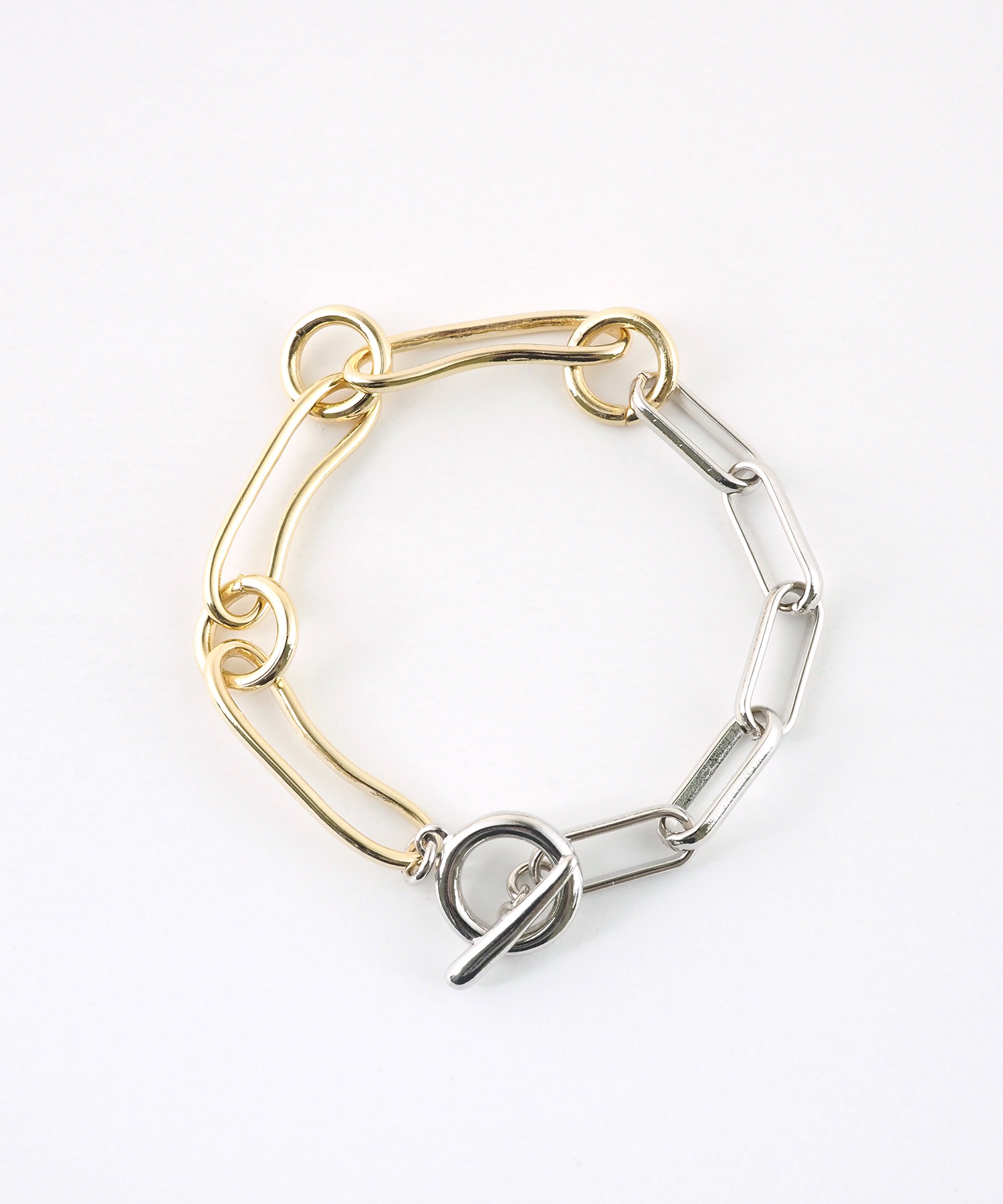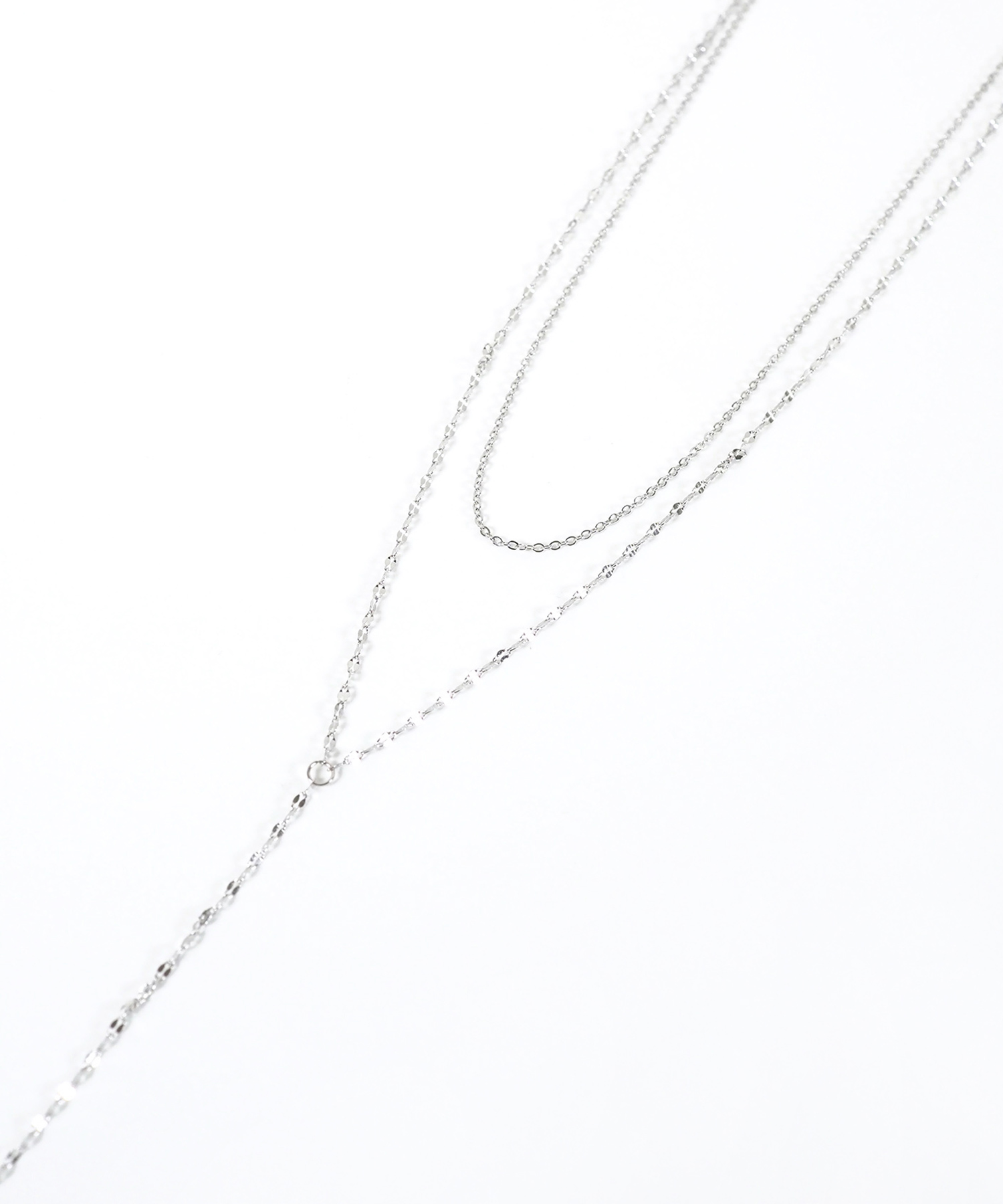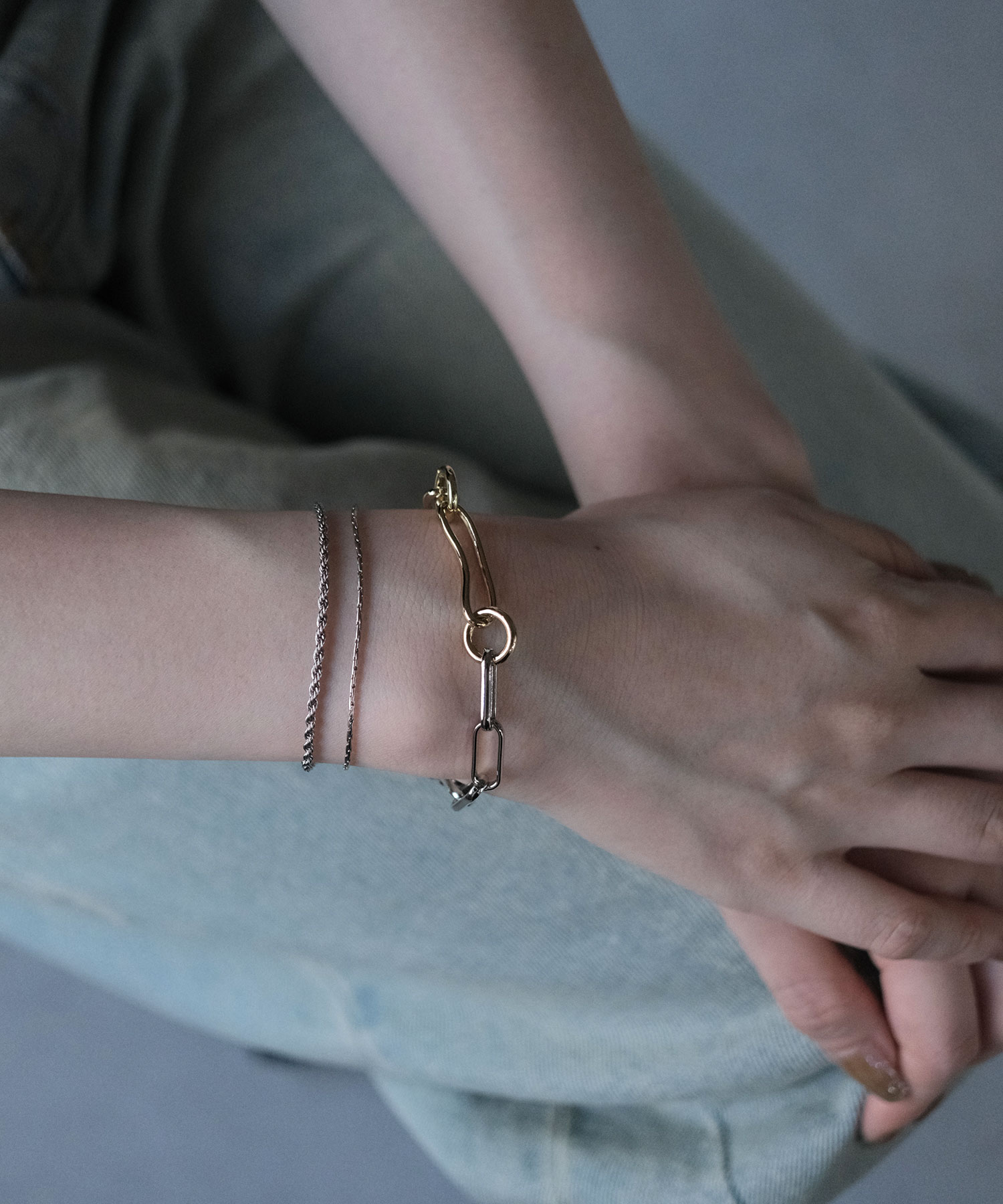 シルバーとゴールドの異なるカラーを組み合わせればカジュアルに、チェーンや煌めくデザインを重ねればきれいめに仕上がります。