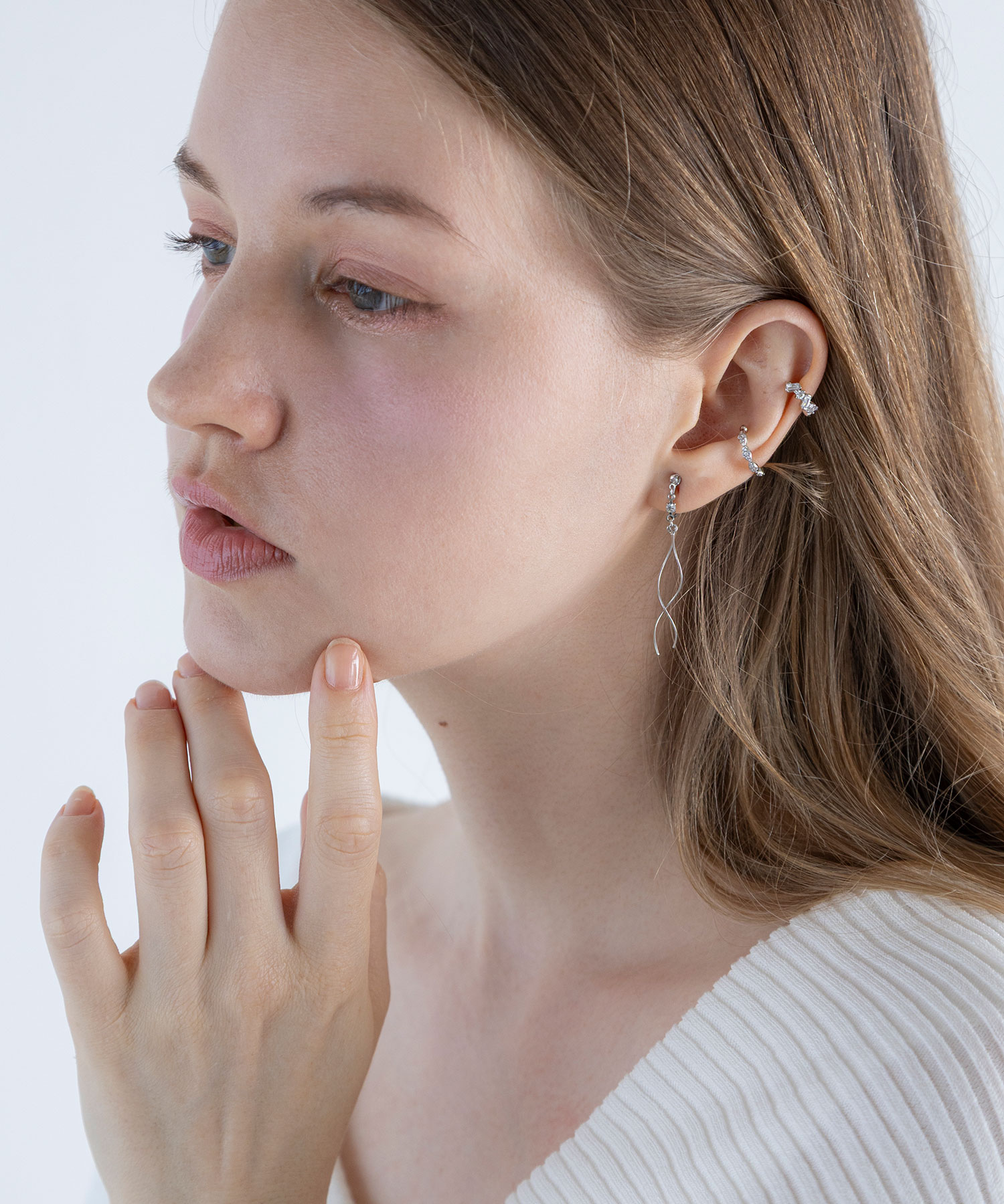 ピアスホールがなくてもイヤーカフを取り入れることで、気軽にレイヤードが楽しめ、シンプルなイヤリングやピアスとの相性も抜群。