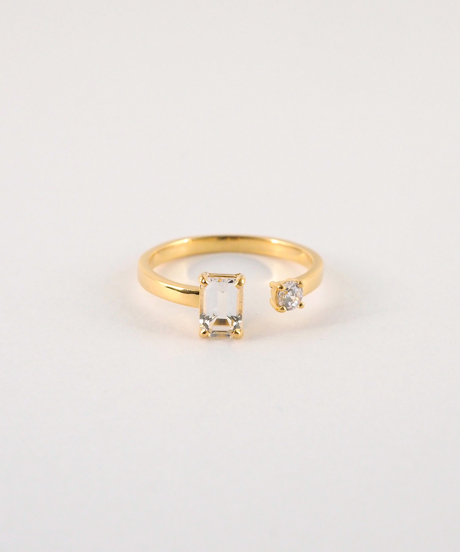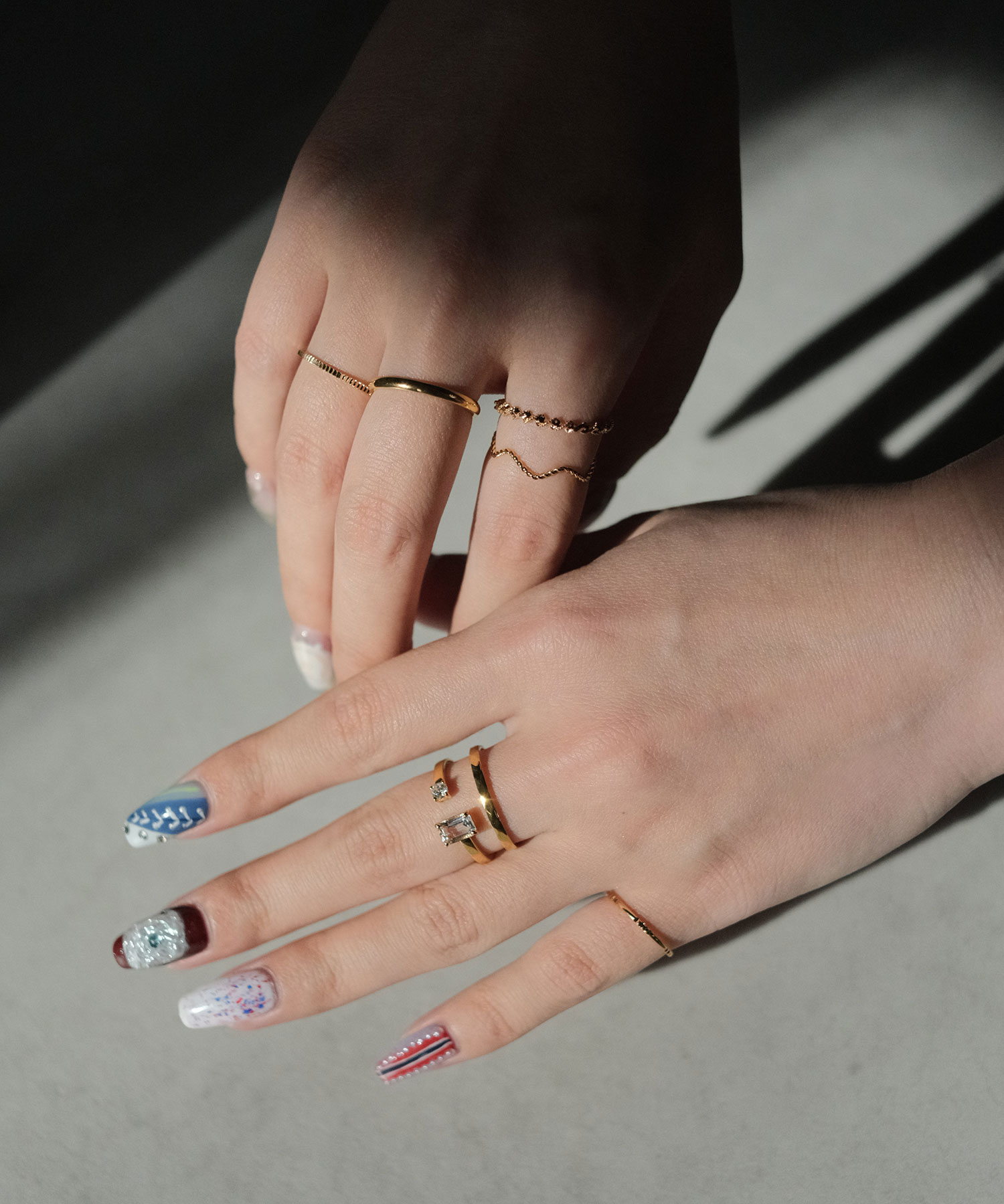 主役にしたいリングは、シンプルなデザインや同じ色を縦に重ねてさらに目立たせて。さらに小指に華奢なリングを添えると素敵になります。