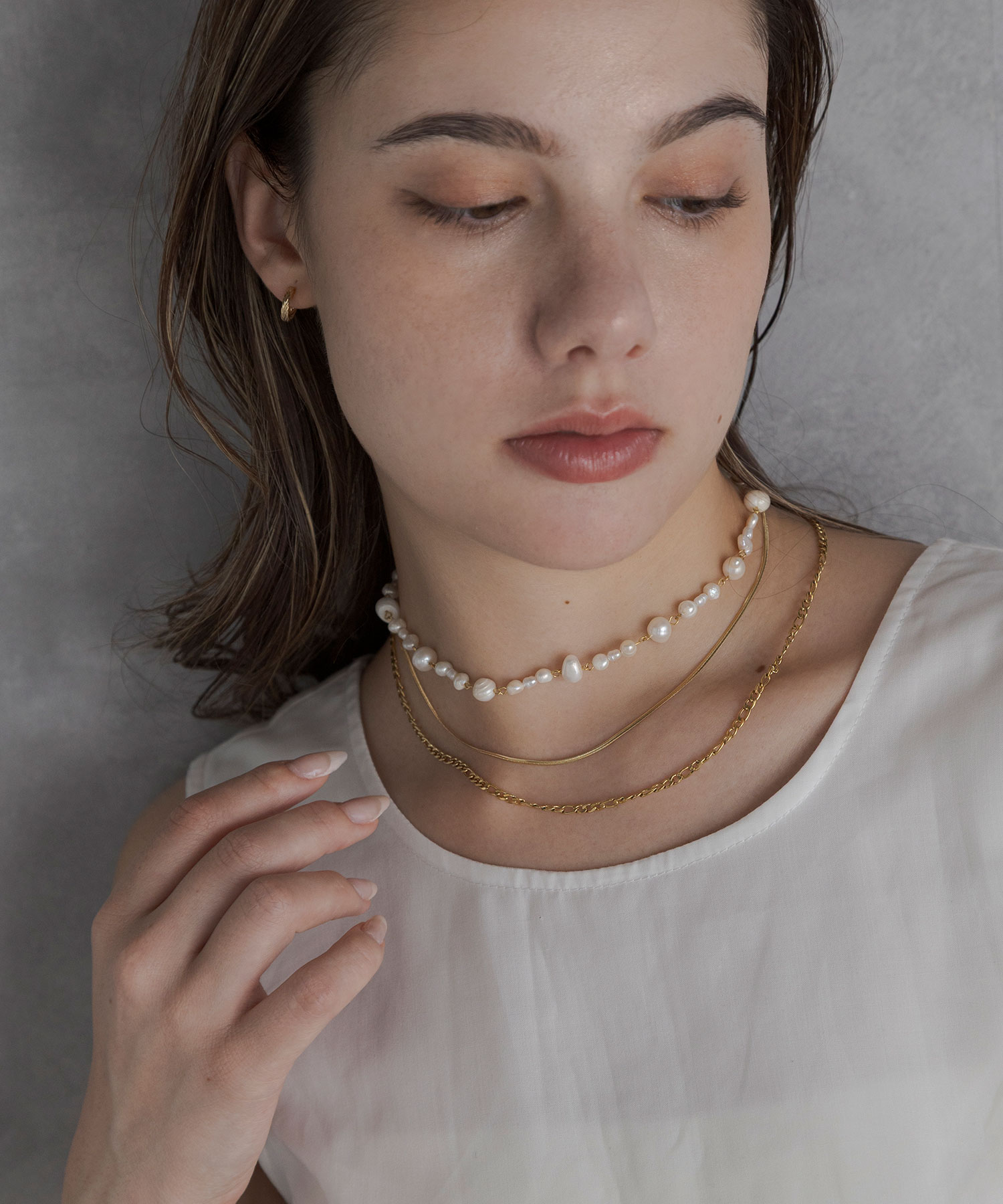 長さや太さを変えて重ねるのがポイント!華奢なチェーンをベースに、パールやチョーカーを重ねるのが失敗しにくく、立体感と抜け感をプラスできます。