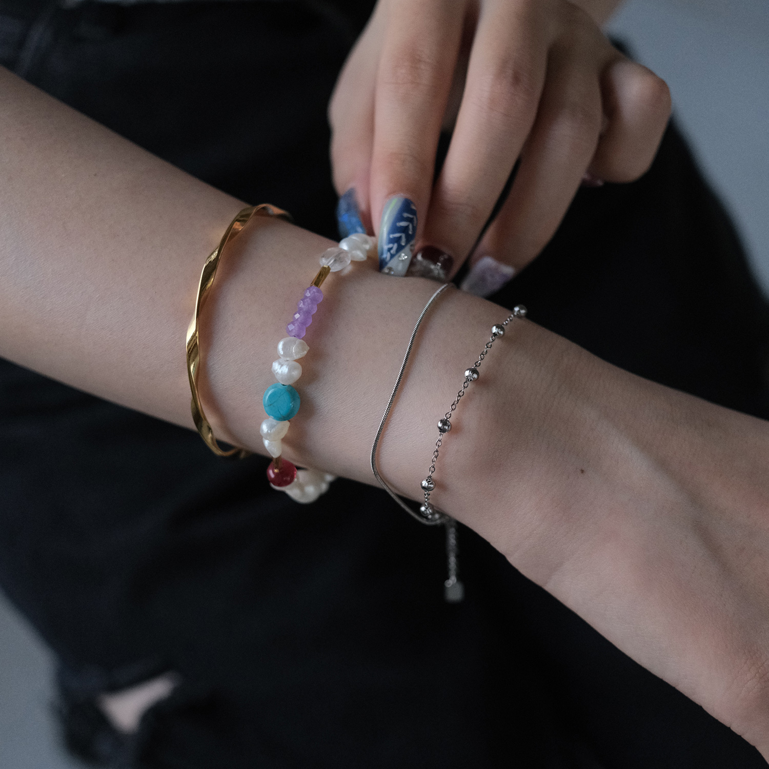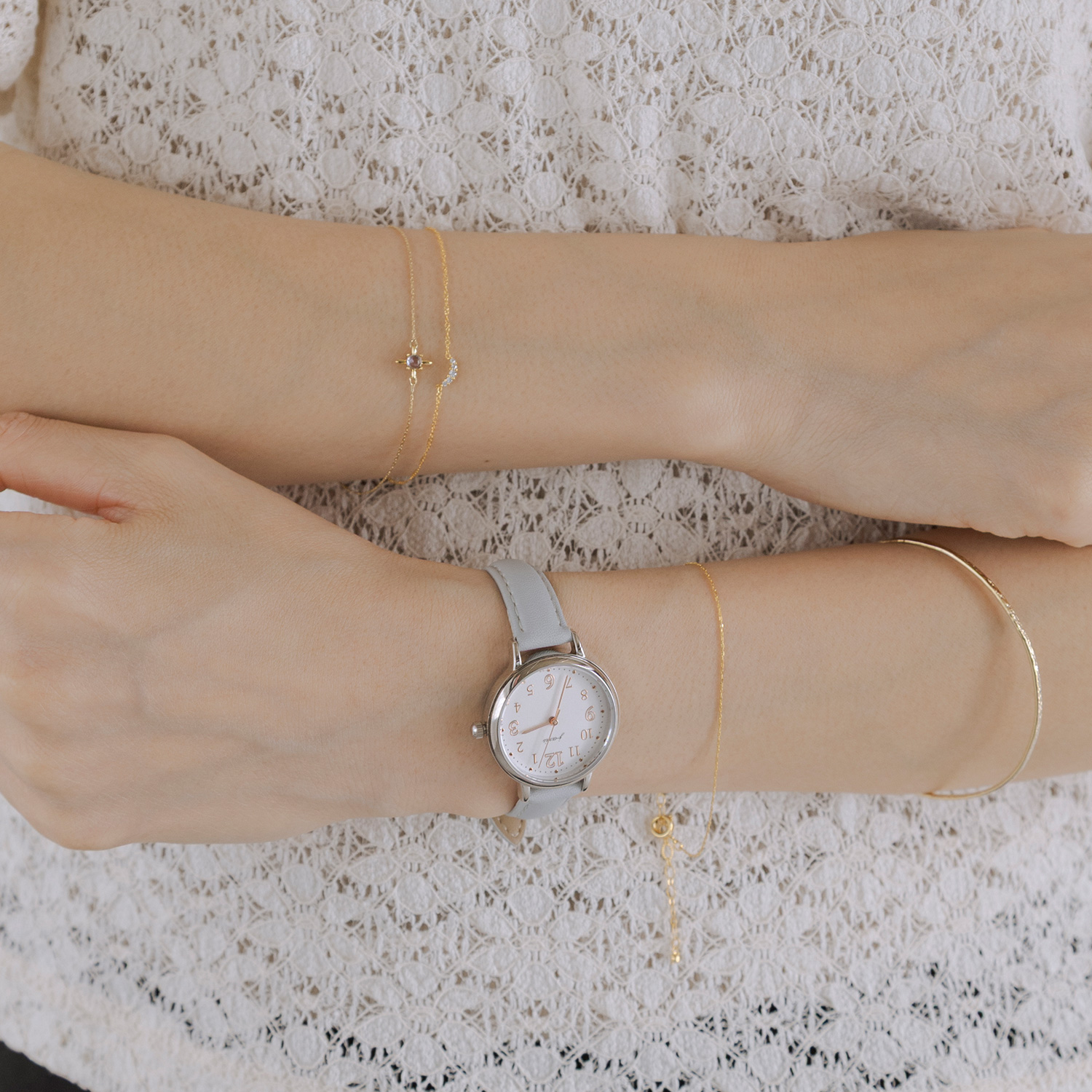手元のレイヤードは、顔まわりやデコルテに比べて視線が集まりにくく、気軽に取り入れやすいのが魅力。とはいえシンプルなコーディネートにも、さりげなくアクセントをプラスできる大切な場所。