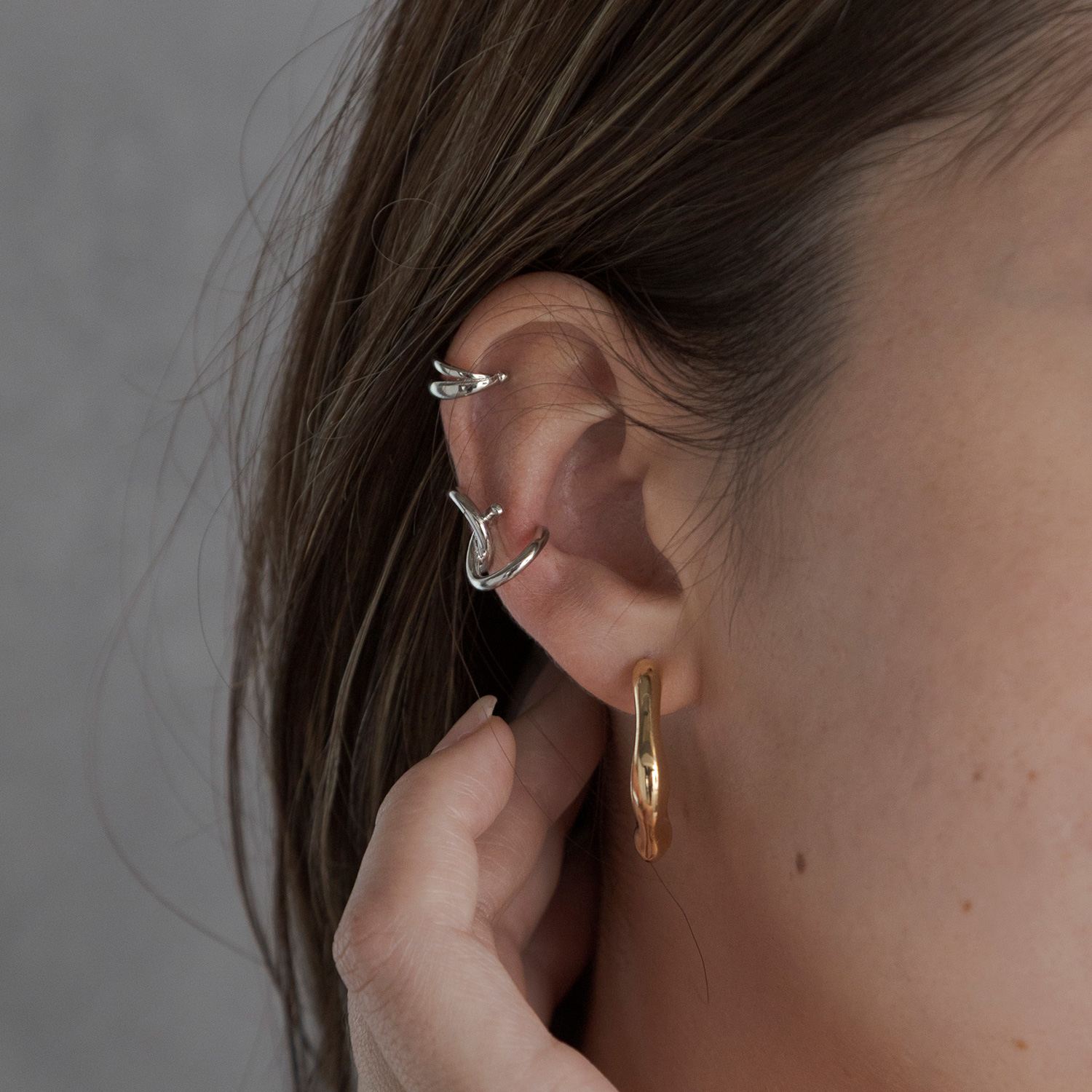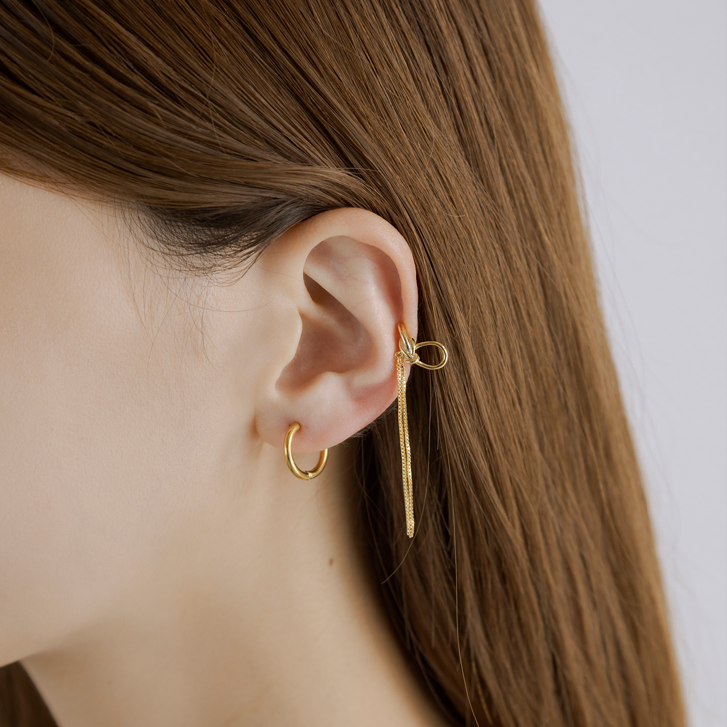 ピアスホールがなくてもイヤーカフを取り入れることで、気軽にレイヤードが楽しめ、シンプルなイヤリングやピアスとの相性も抜群。
