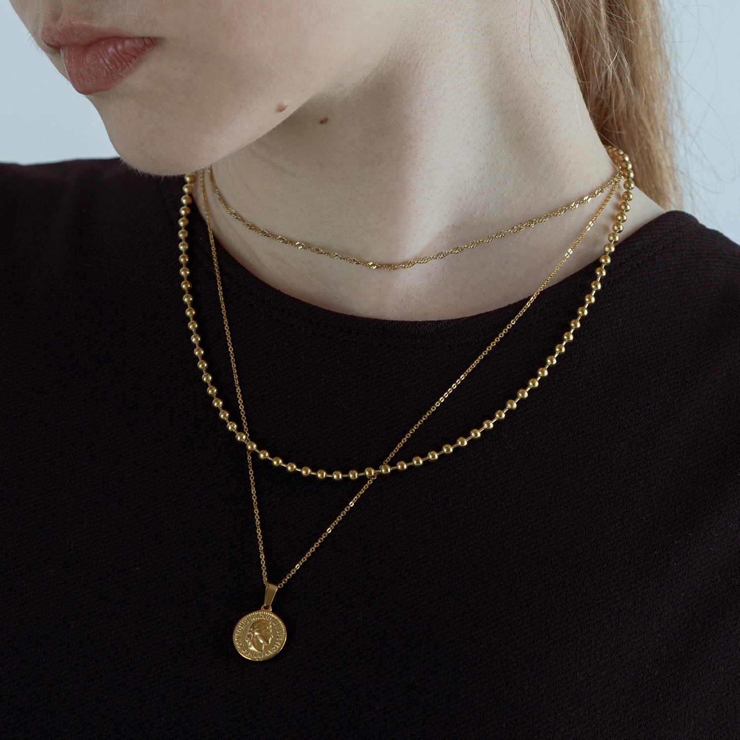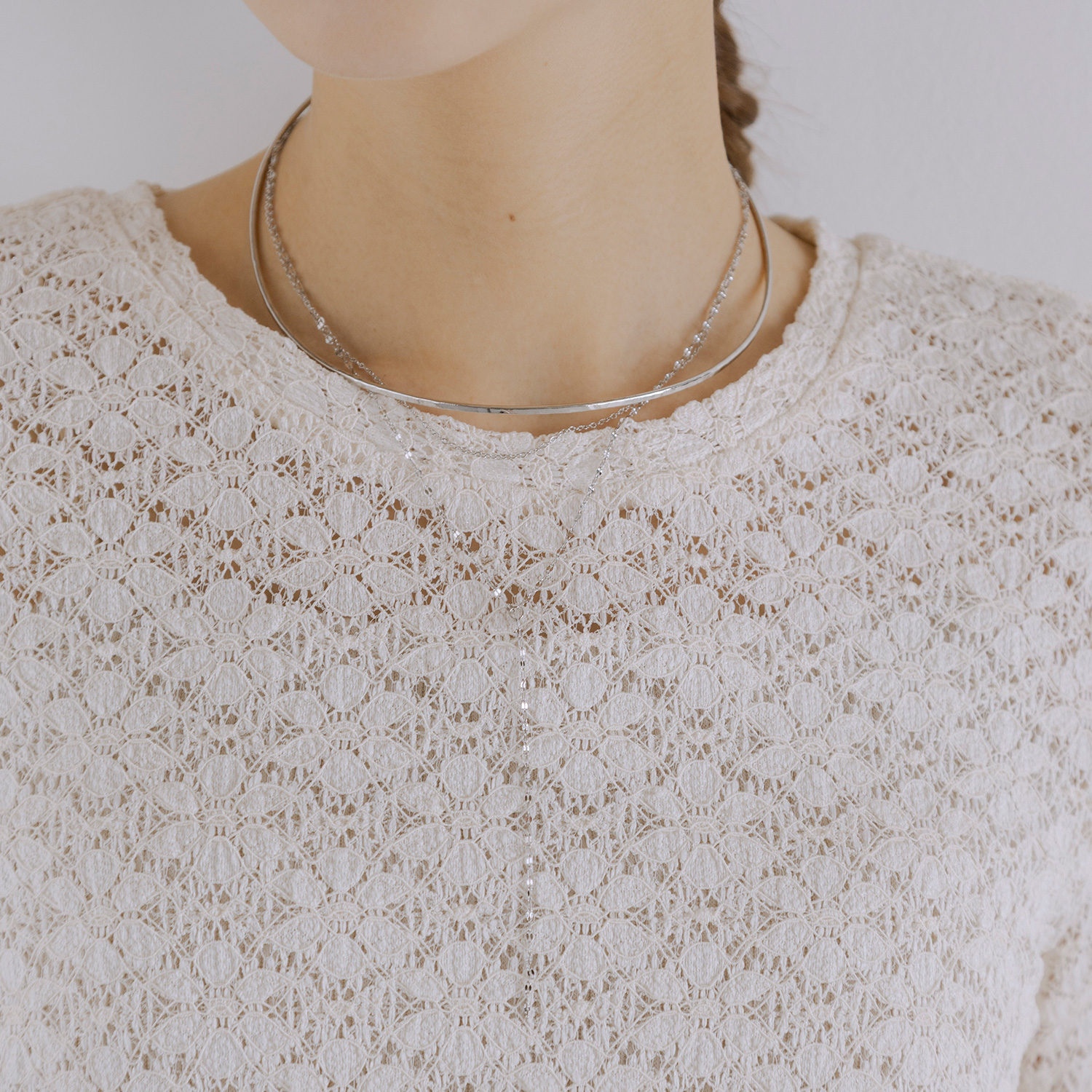 長さや太さを変えて重ねるのがポイント!華奢なチェーンをベースに、パールやチョーカーを重ねるのが失敗しにくく、立体感と抜け感をプラスできます。