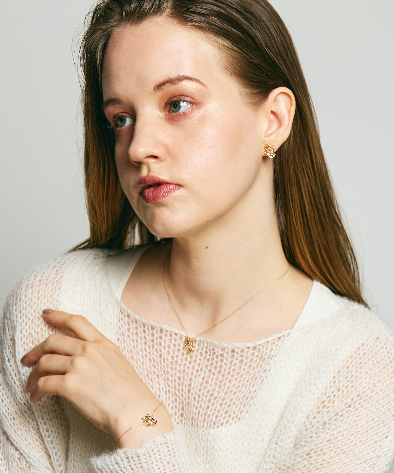 揺れるピアスやイヤーカフは光を反射し、顔まわりに輝きを添え、華奢なネックレスやブレスレットは、10金の輝きで上品な雰囲気を演出します。