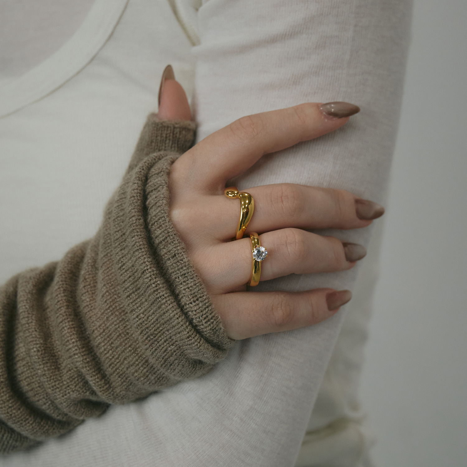 大粒のキュービックジルコニアは照明に照らされ華やぎのアクセントをもたらし、ボリュームピアスは顔周りにメリハリを与えます。また、2wayリングやダブルフィンガーリングで手元にトレンド感をプラスし、コーディネートを自在に楽しめます。