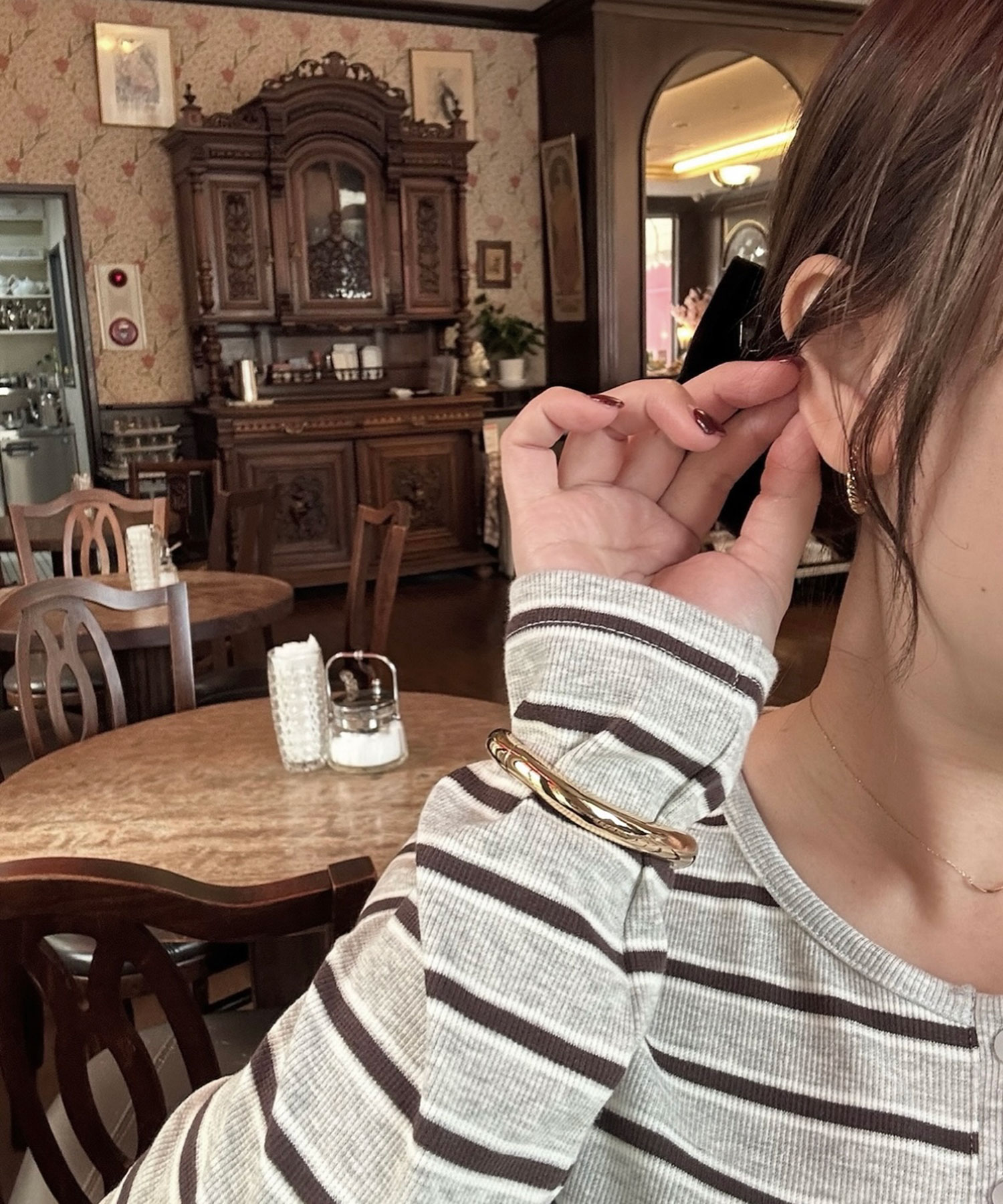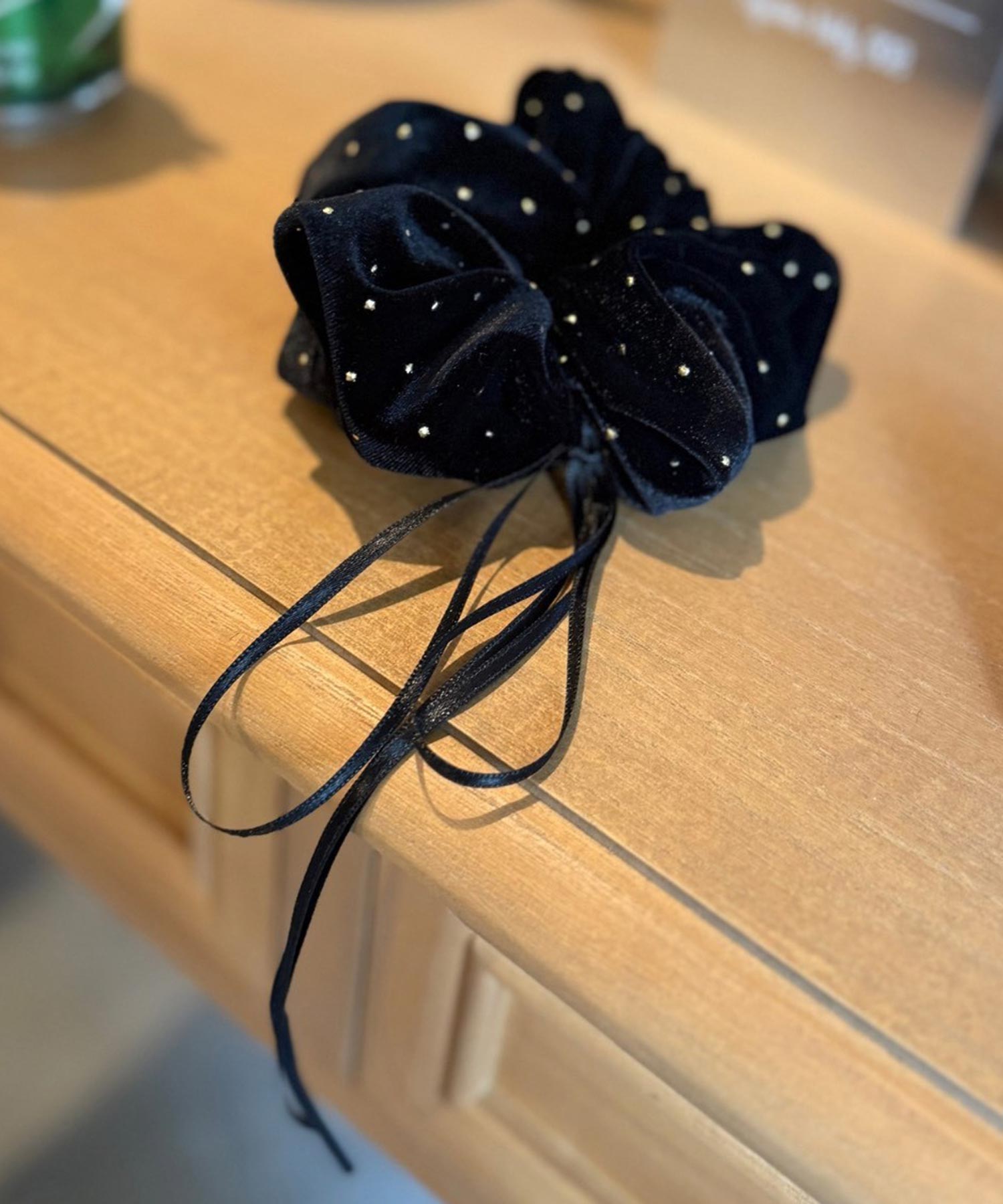 小ぶりなピアスとループタイに一目惚れ!ドット柄のシュシュも一緒に合わせて、大人モードな気分♪