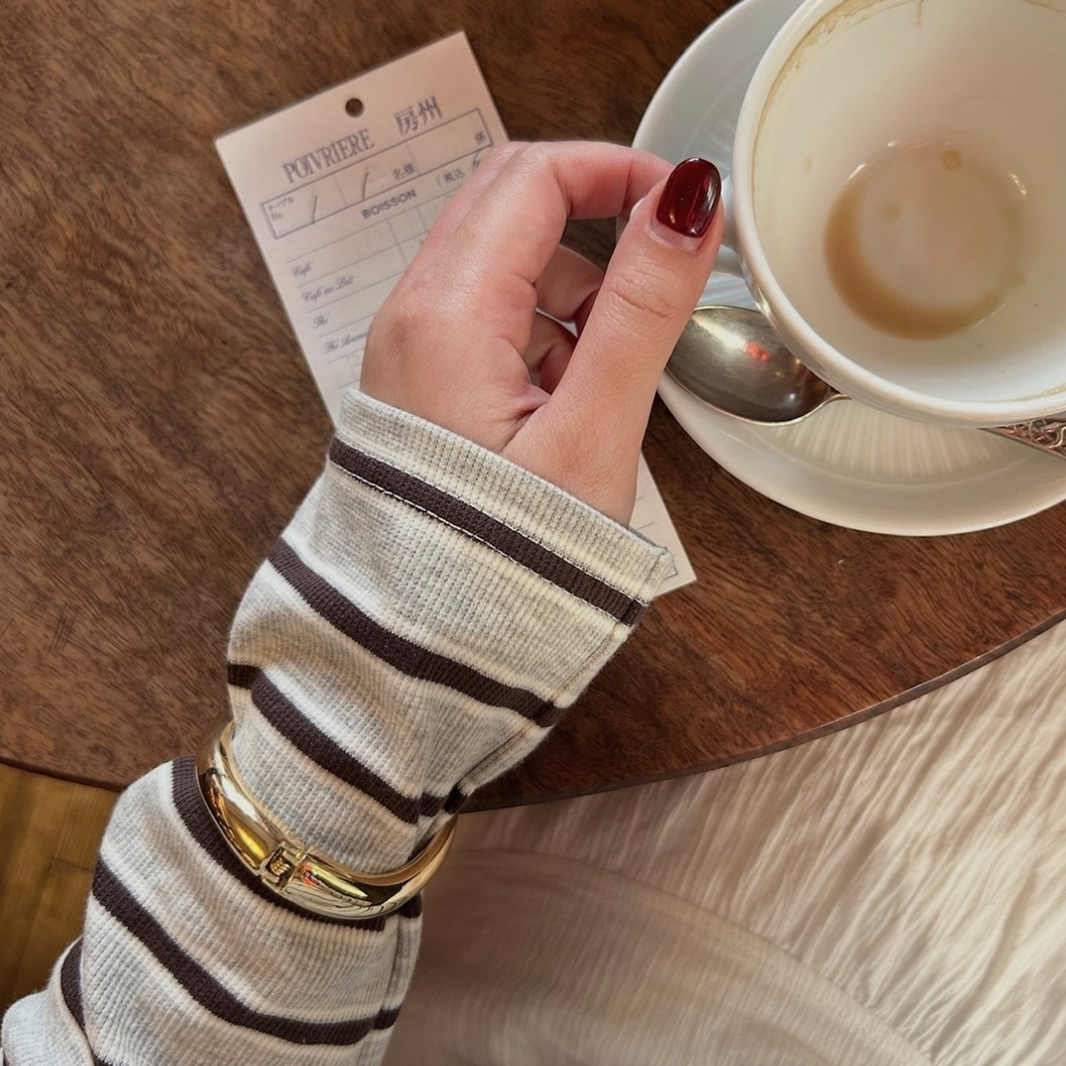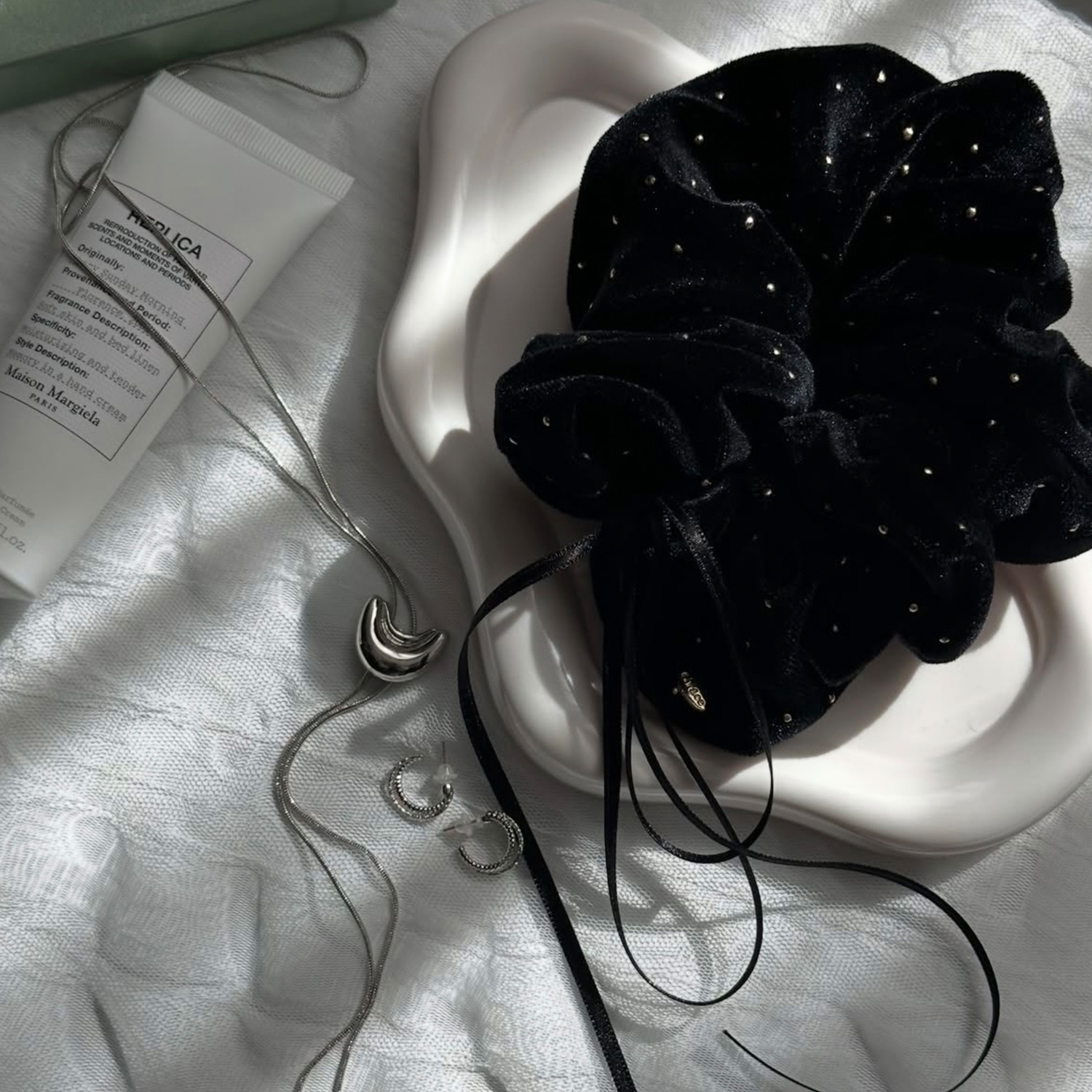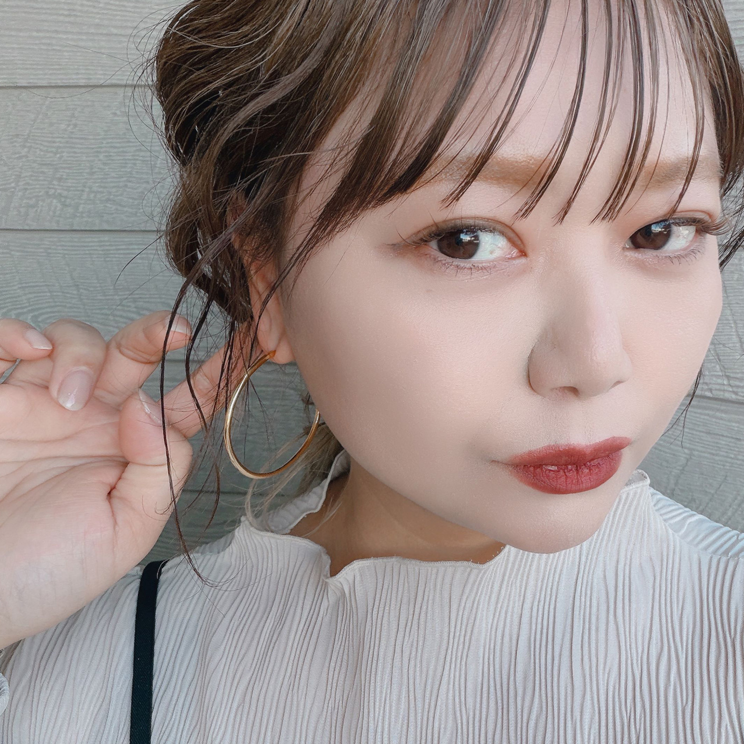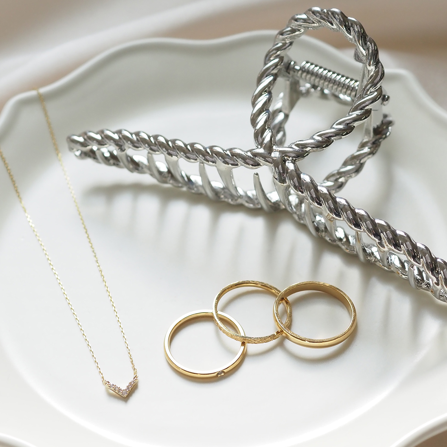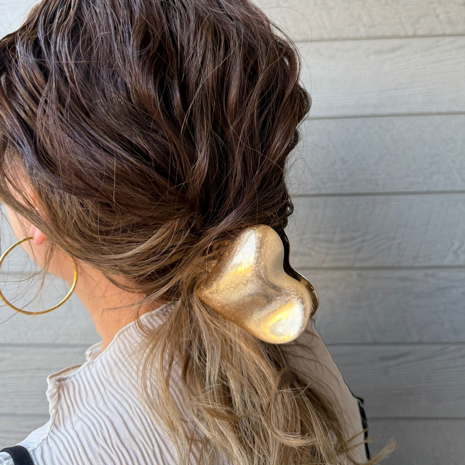 トレンドの大ぶりモチーフを主役に。ツヤ感フープ×マットバンスの「質感コントラスト」が、こなれた大人カジュアルに格上げ!