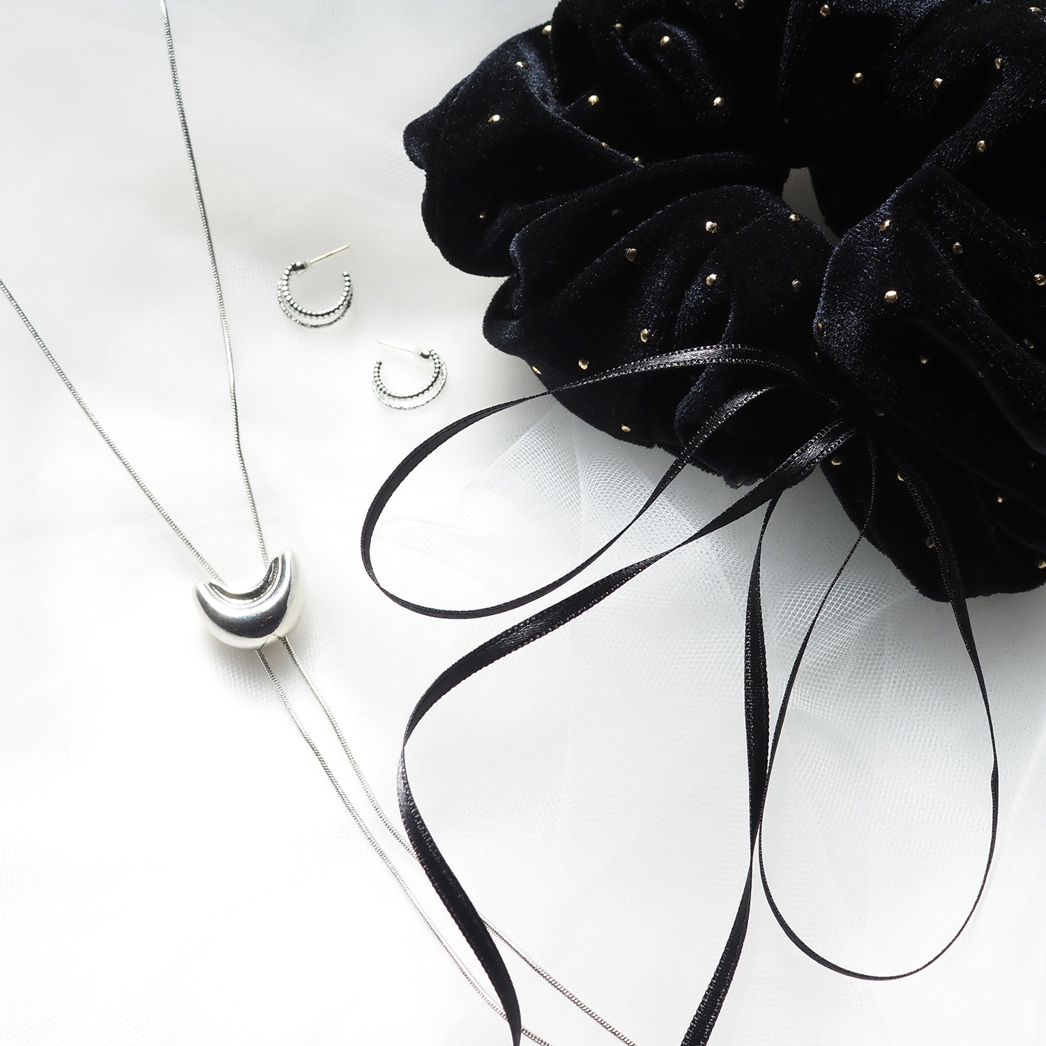 質感の違うダブルフープが耳元に奥行きをプラスし、注目のドット柄も、ループタイで引き締めれば一気にモードスタイルに変身!