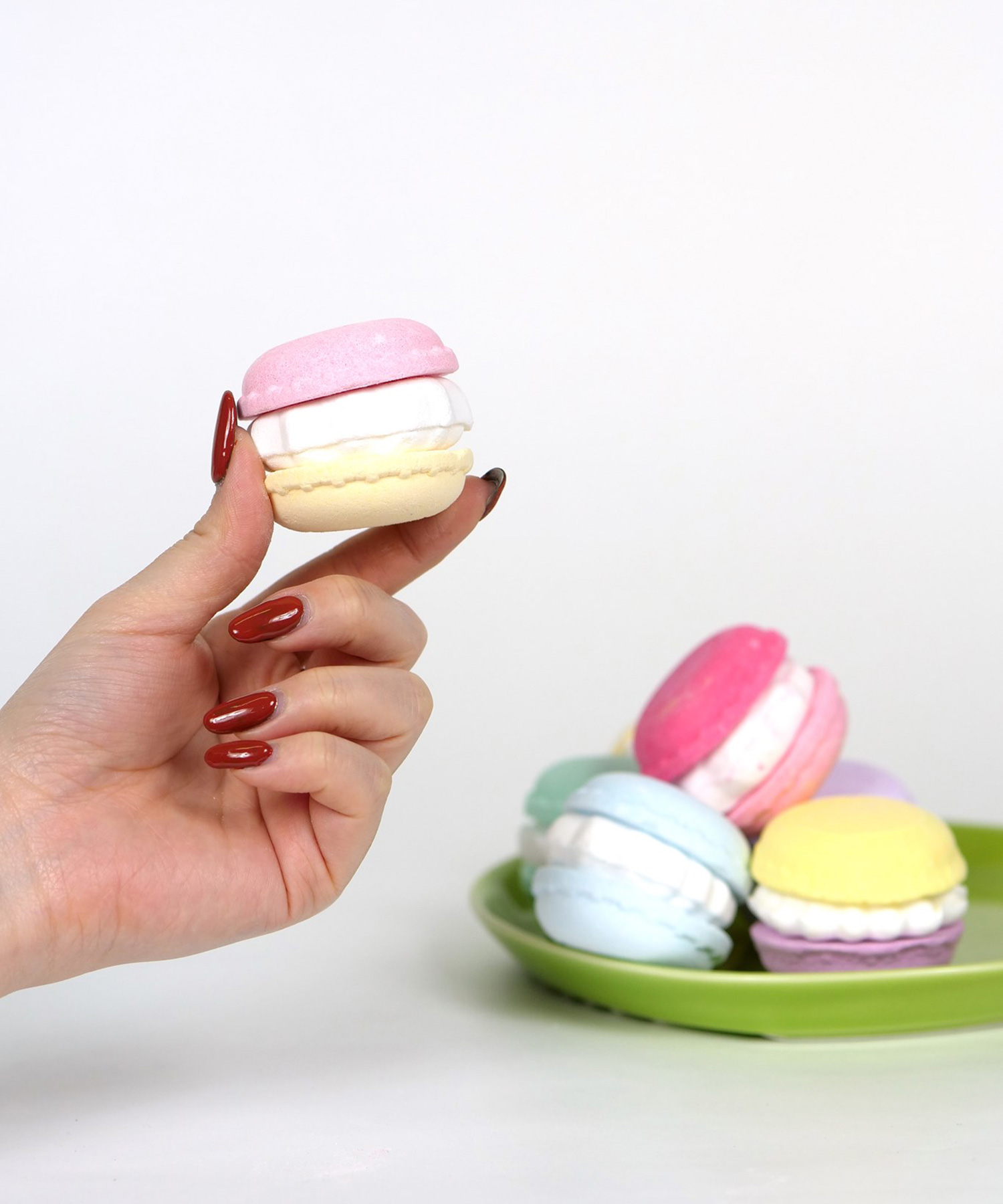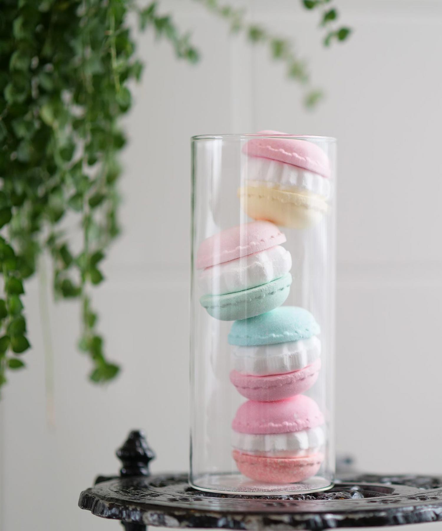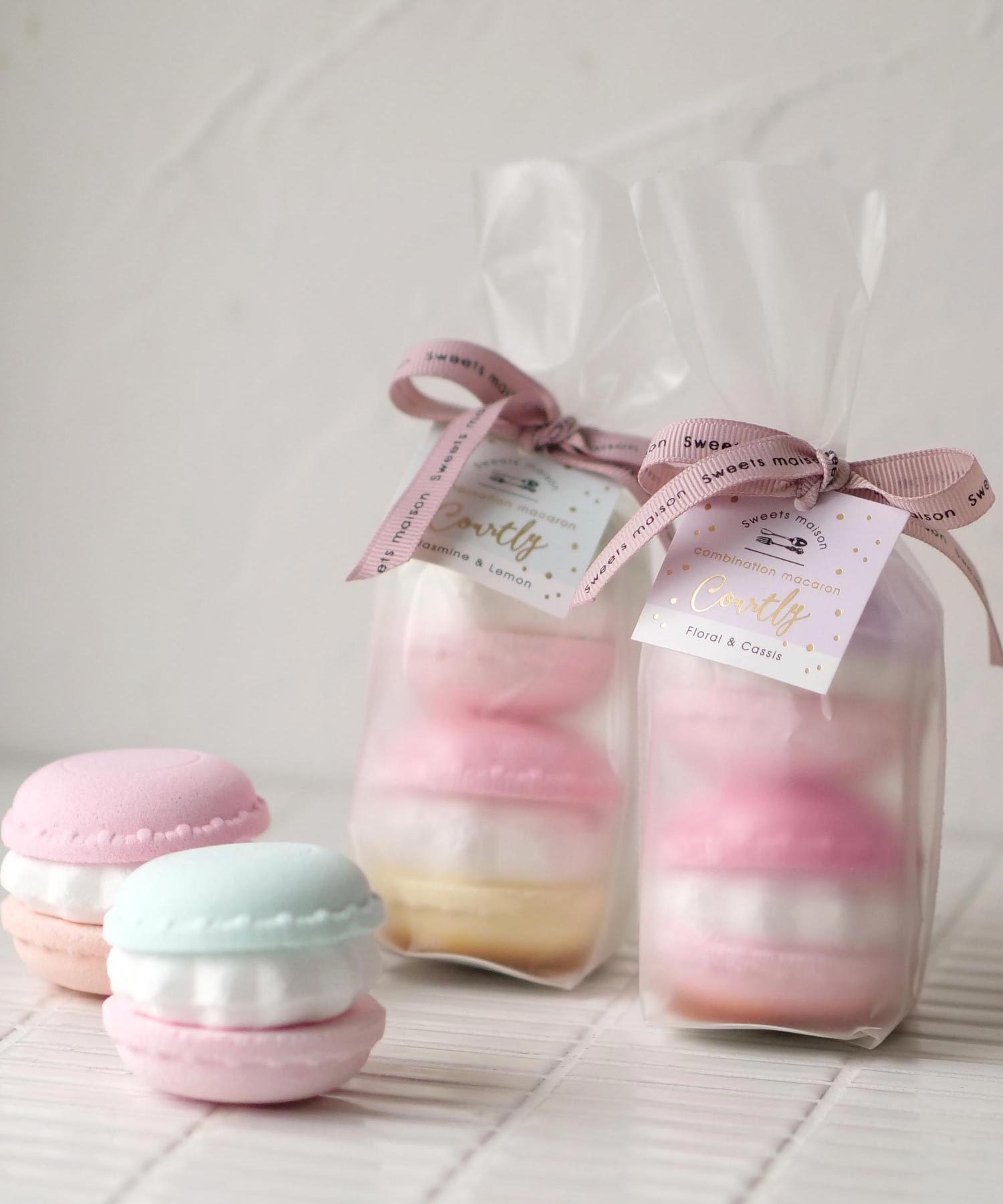 カラフルで本物のマカロンのような見た目に、スモーキーピンクのリボンがポイント。