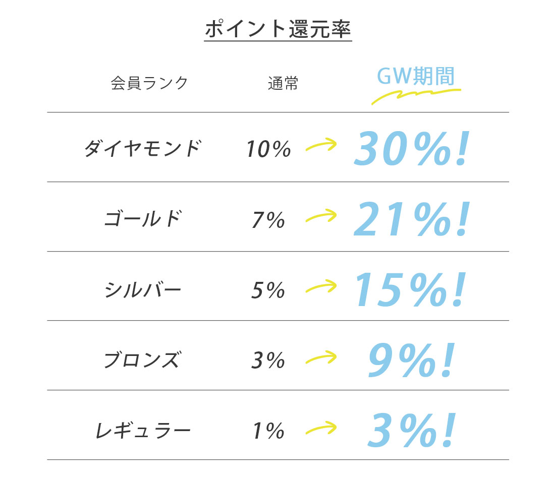 例えば、シルバー会員様が5,000円のお買い物をされた場合、通常150ポイントのところ、期間中は450ポイントもらえて実質15%オフ♪