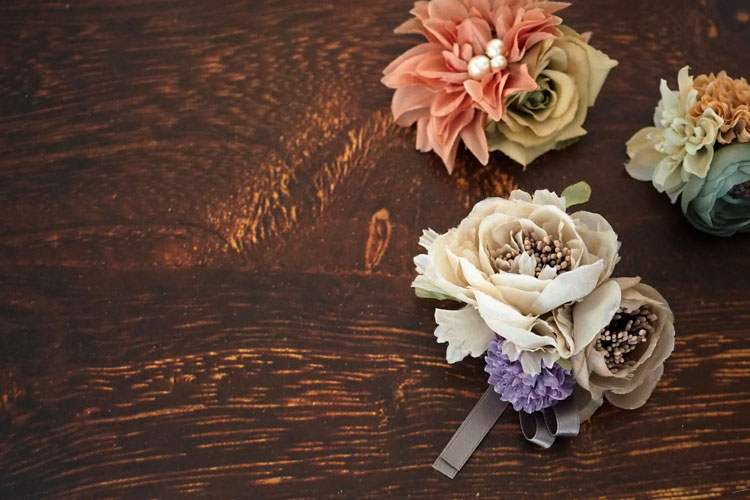 晴れやかさを演出するコサージュはセレモニーシーンに欠かせないアイテム。