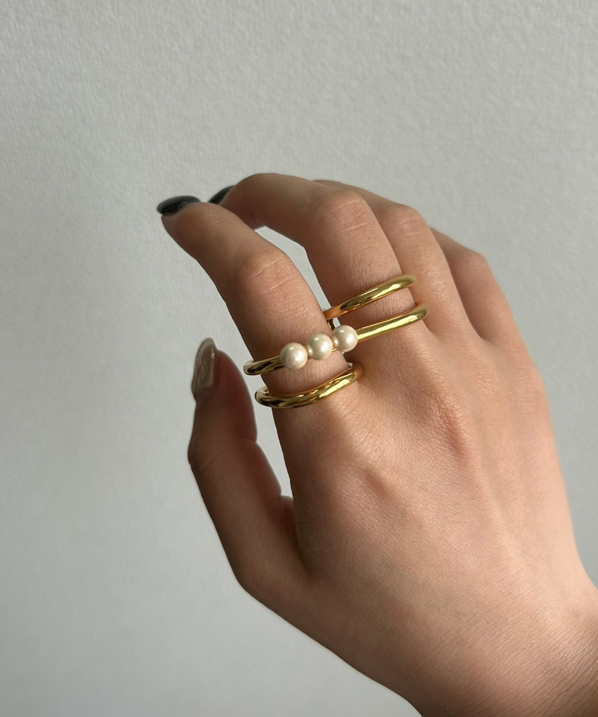隣り合わせの指を2本通して楽しむデザインリング。パールとメタルの組み合わせが手元を上品に見せてくれます!