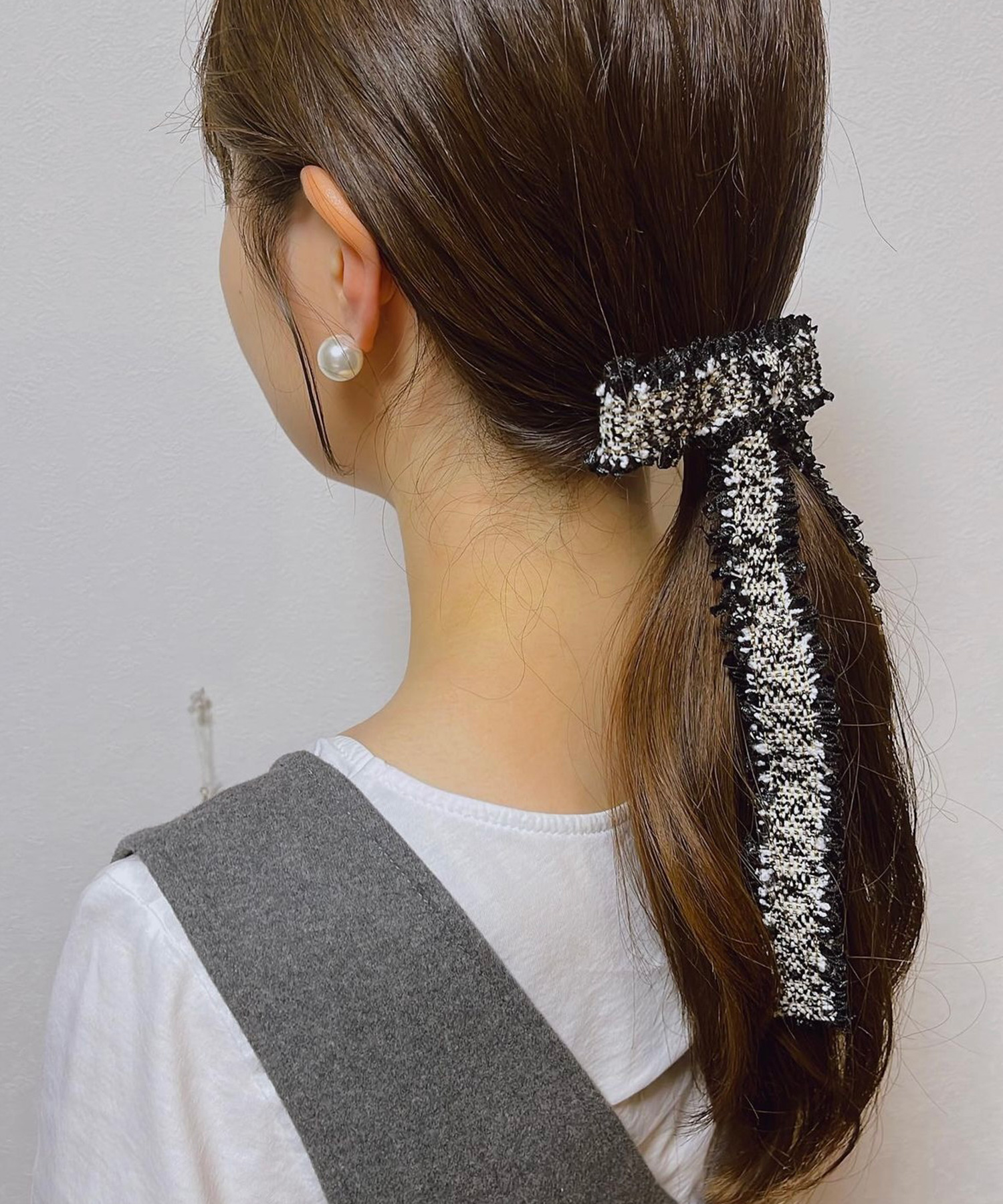 オケージョンシーンにおすすめのフラワーバレッタ。耳元もパールで合わせるとコーデがまとまります♪